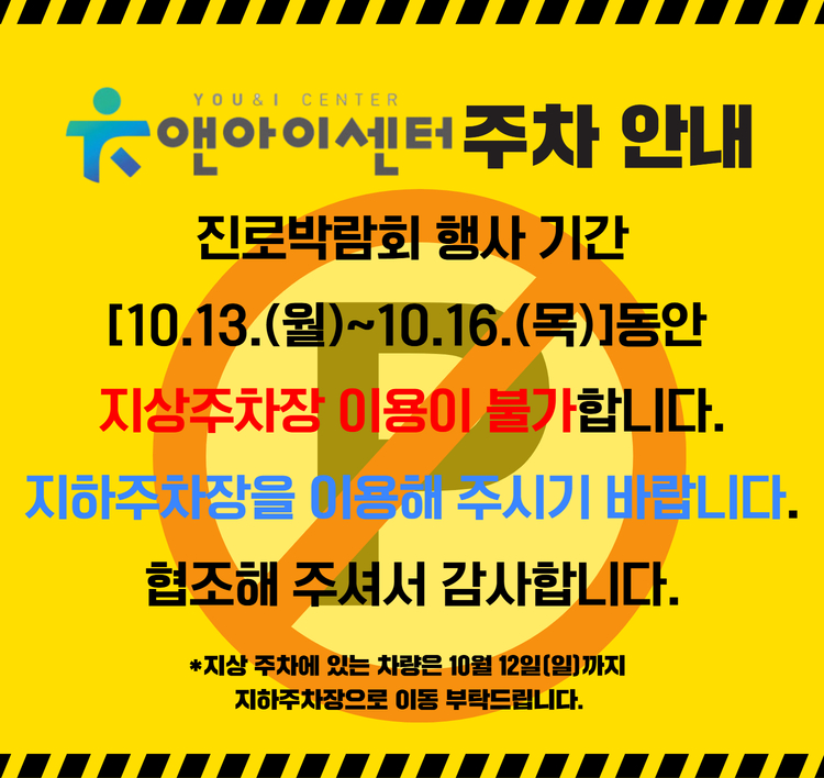 | 제목 | [공지] 청소년 진로박람회 행사 기간 유앤아이센터 주차장 이용 안내 | ||