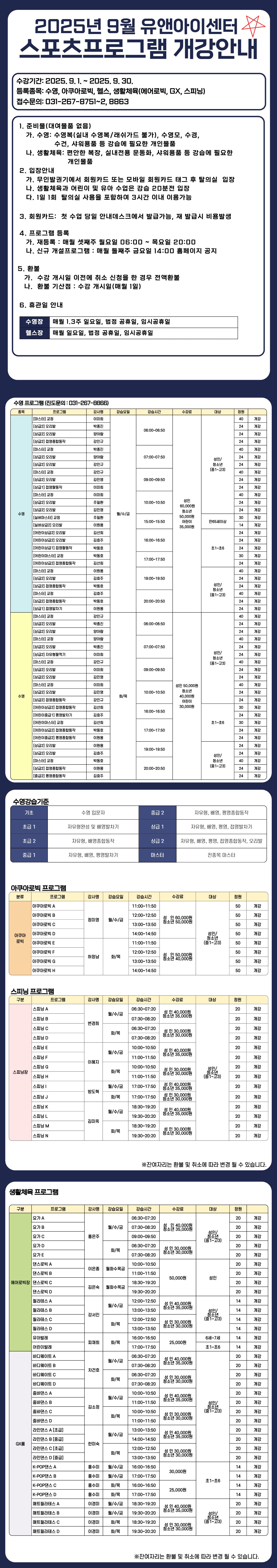 제목 2025년 9월 스포츠프로그램[수영, 아쿠아로빅, 헬스, 에어로빅, GX, 스피닝] 개강 안내 운영센터 유앤아이센터 작성일 2025년 8월 29일 9시 53분 조회수 1,922 첨부 파일 아이콘25년 9월 개강공지.jpg (2.17MB)다운로드 아이콘 목록보기