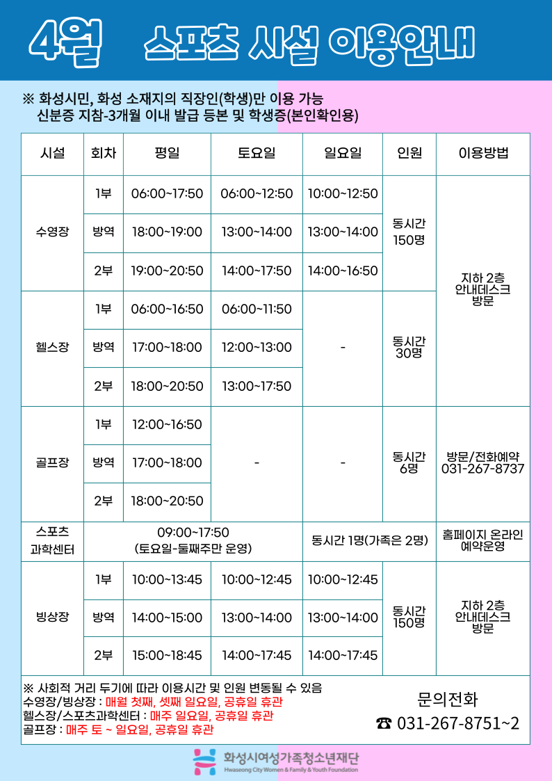 제목 [유앤아이센터]2022년 4월 스포츠시설 이용안내 운영센터 유앤아이센터 작성일 2022년 3월 18일 14시 29분 조회수 3,082 첨부 파일 아이콘4월-스포츠시설-이용안내.png (221.07KB)다운로드 아이콘 목록보기