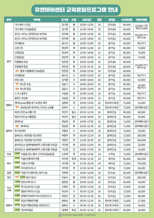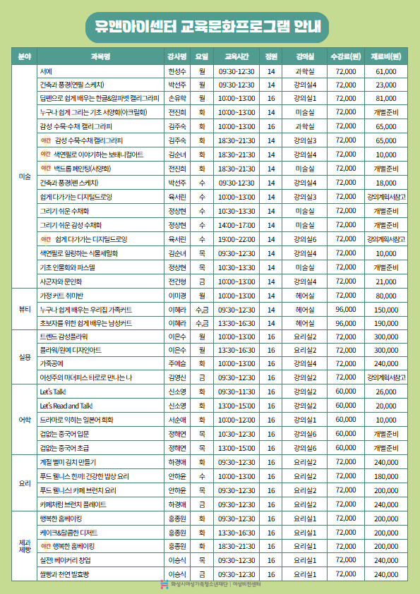 | 제목 | [화성시여성비전센터] 2026년 1학기 유앤아이센터 교육 프로그램 수강생 모집(26. 1. 5.~1. 20.) | |||||||||||||||||||||||||||||