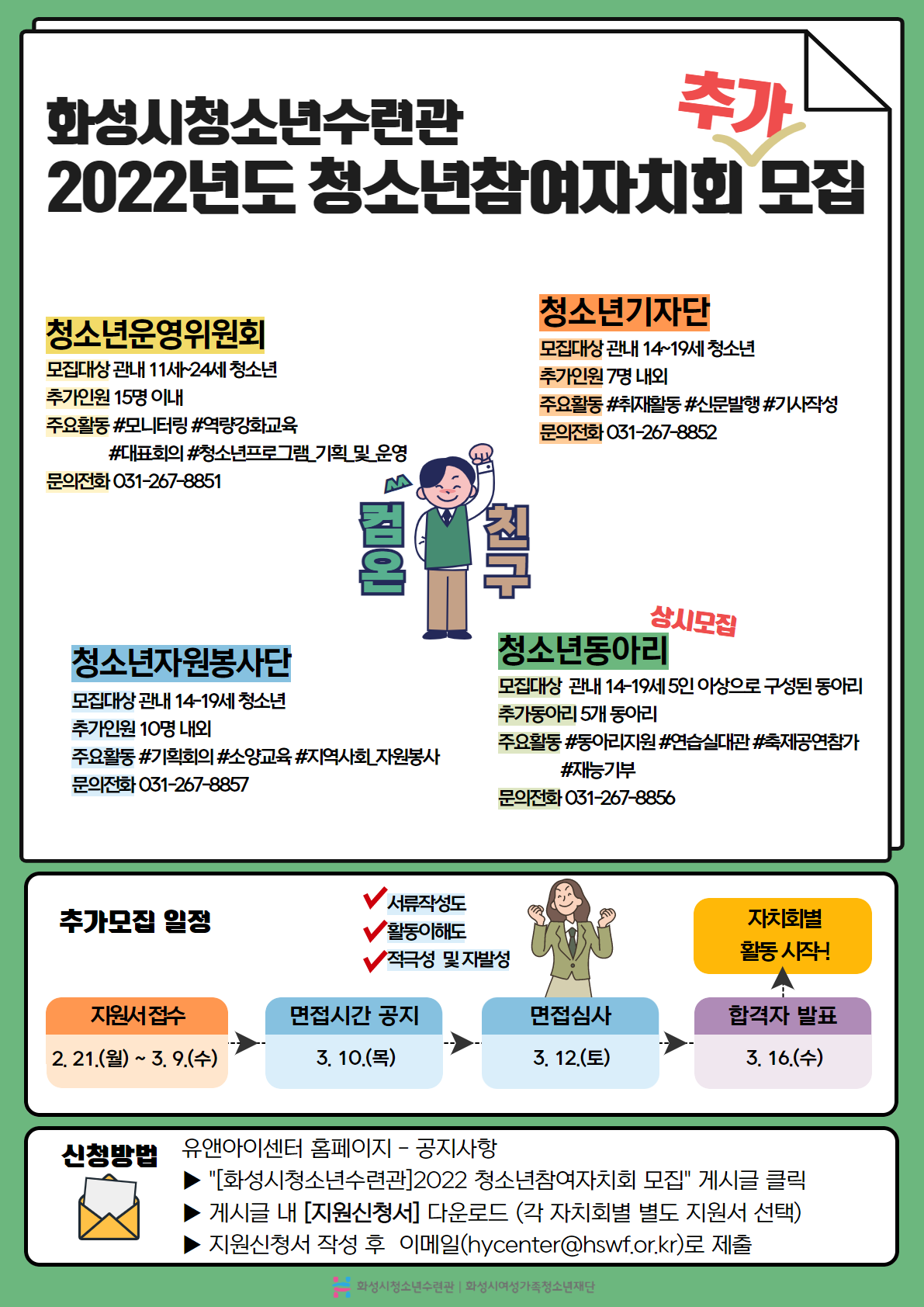 제목 2022년 청소년참여자치기구(운영위원회, 봉사단, 기자단, 동아리) 추가모집 안내