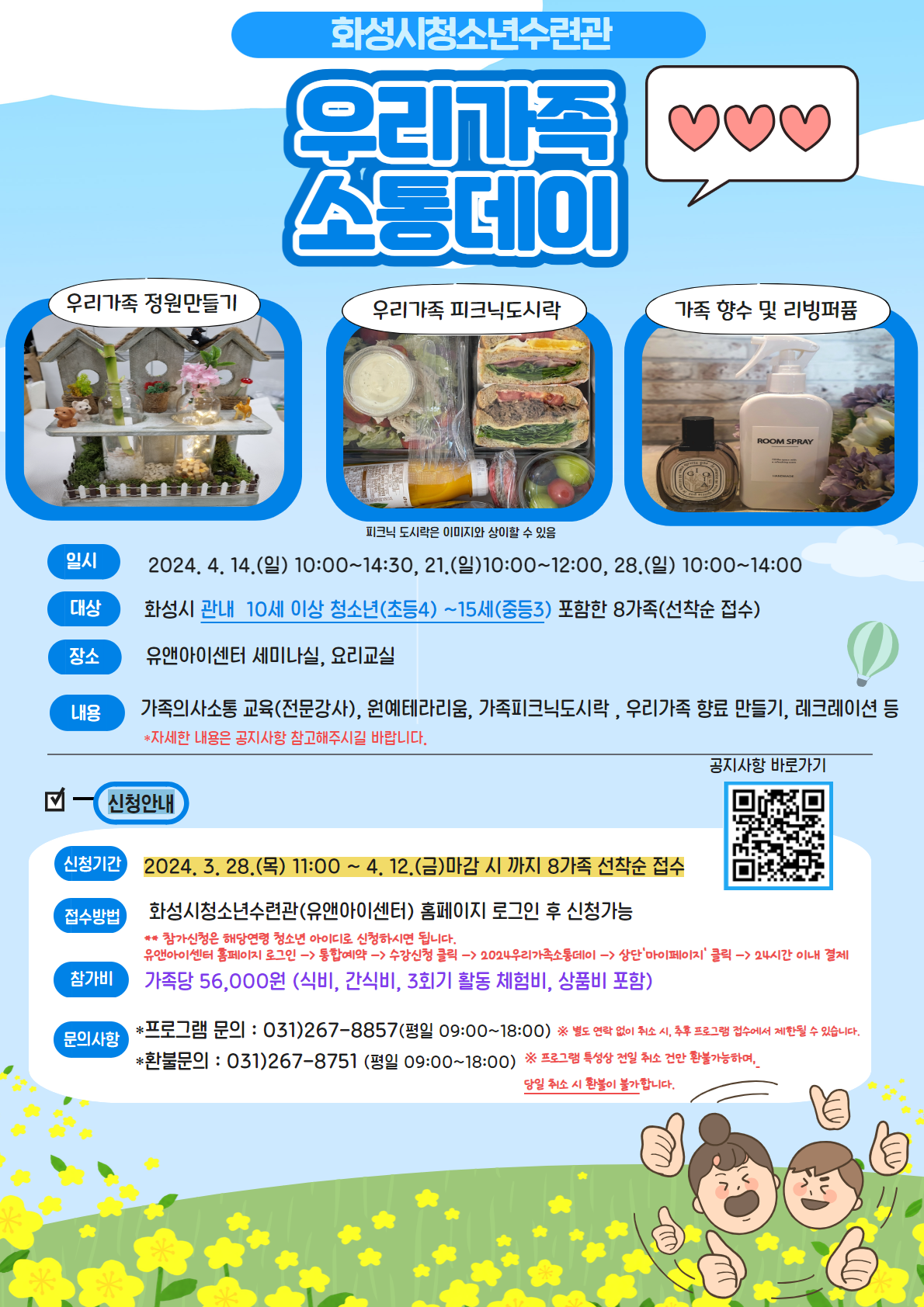 1. 2024우리가족소통데이 프로그램 안내 1) 활동안내 - 일시: 4월14일(일) 10:00~14:30, 21일(일) 10:00~12:00, 28일(일) 10:00~14:00 총 3회기 - 대상: 화성시 관내 10세이상 청소년(초등4)~15세(중등3) 포함한 8가족 (3~5인)선착순 신청 - 장소 : 화성시청소년수련관 - 내용 : 가족의사소통교육(전문강사), 가족정원, 가족피크닉도시락, 가족향료만들기, 레크레이션 등 2) 신청방법 -신청기간: 2024. 3.28.(목) 11:00 ~ 마감시까지 8가족 선착순 접수 -신청방법: 화성시청소년수련관(유앤아이센터) 홈페이지 로그인 후 신청가능 *참가신청은 해당 연령 청소년 아이디로 한 가족당 한아이디로 신청하시면 됩니다. [유앤아이센터 홈페이지 로그인 -> 통합예약 -> 수강신청 클릭 -> 유앤아이센터-> 화성시청소년수련관-> 2024우리가족소통데이 -> 상단'마이페이지' 클릭 -> 24시간이내 결제] -참가비: 한 가족당 56,000원(점심식사2회, 간식비, 3회기 활동체험비, 상품비 포함)
