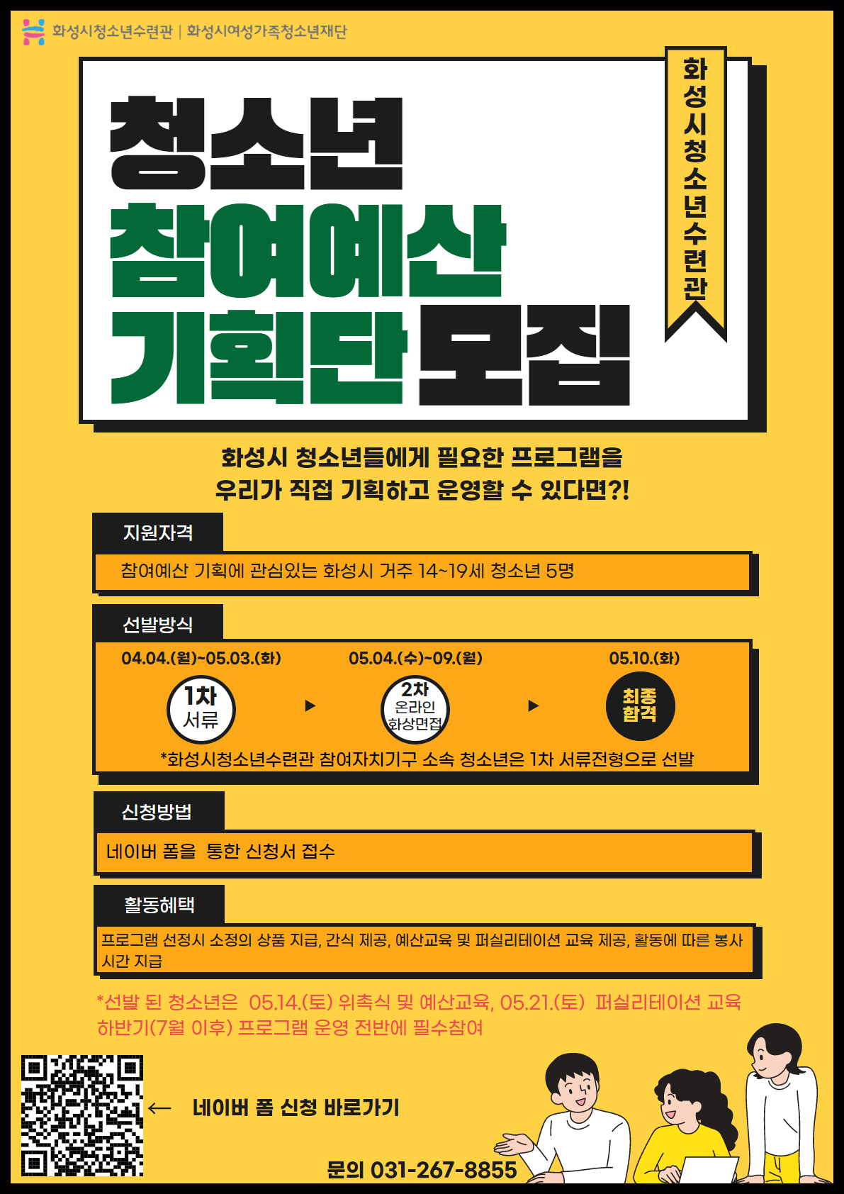 | 제목 | [화성시청소년수련관] 청소년참여예산 기획단 참가자 모집(연장) | ||