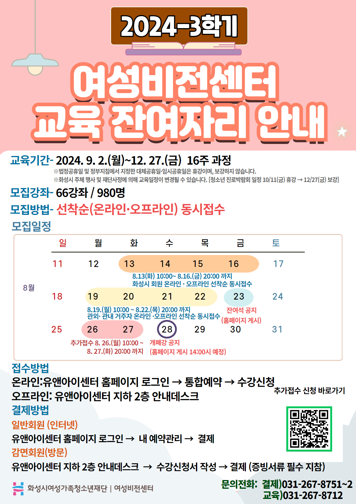 1. 추가 모집 기간 및 방법 안내 □ 추가 모집기간: 2024. 8. 26.(월) 10:00시~8. 27.(화) 20:00시 □ 모집방법: 온라인·오프라인(방문) 선착순 동시접수 □ 온라인 신청방법 ○ 홈페이지 로그인(통합예약→수강신청→유앤아이센터→여성비전센터교육→배움 또는 자격과정→조회→해당강좌 접수하기 클릭 후 수강신청) - 접수마감일 8월 27일(화) 20:00까지 결재해야 등록이 완료됩니다. □ 오프라인(방문) 신청방법(신분증 지참) ○ 유앤아이센터 지하2층 안내데스크(주말제외) 결제 ○ 감면대상자, 화성시 소재 직장 근무자: 증빙서류 지참 후 현장 방문(지하2층 안내데스크) 결제 - 단 65세이상 인터넷 접수 시 감면이 자동 적용되며 현장 방문 및 서류 제출이 불필요합니다. 2. 수강 신청 과목 모집 정원 대비 등록인원 60% 미만 시 폐강될 수 있으며, 잔여자리는 환불에 따라 변경될 수 있습니다. 3. 법정 공휴일 및 정부 지침에서 지정한 대체공휴일, 임시공휴일은 휴강이며 보강하지 않습니다. 4. 개.폐강 공지: 홈페이지 게시 2024. 8. 28.(수) 14:00시 예정