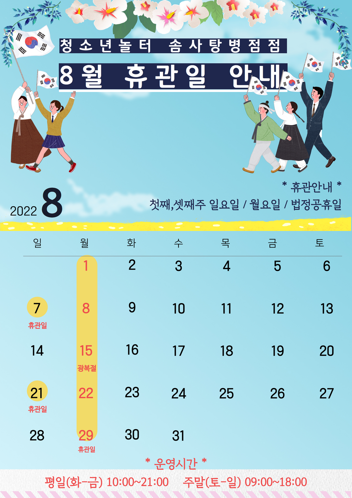 [화성시청소년수련관] 청소년놀터 병점점 8월 휴관일 안내