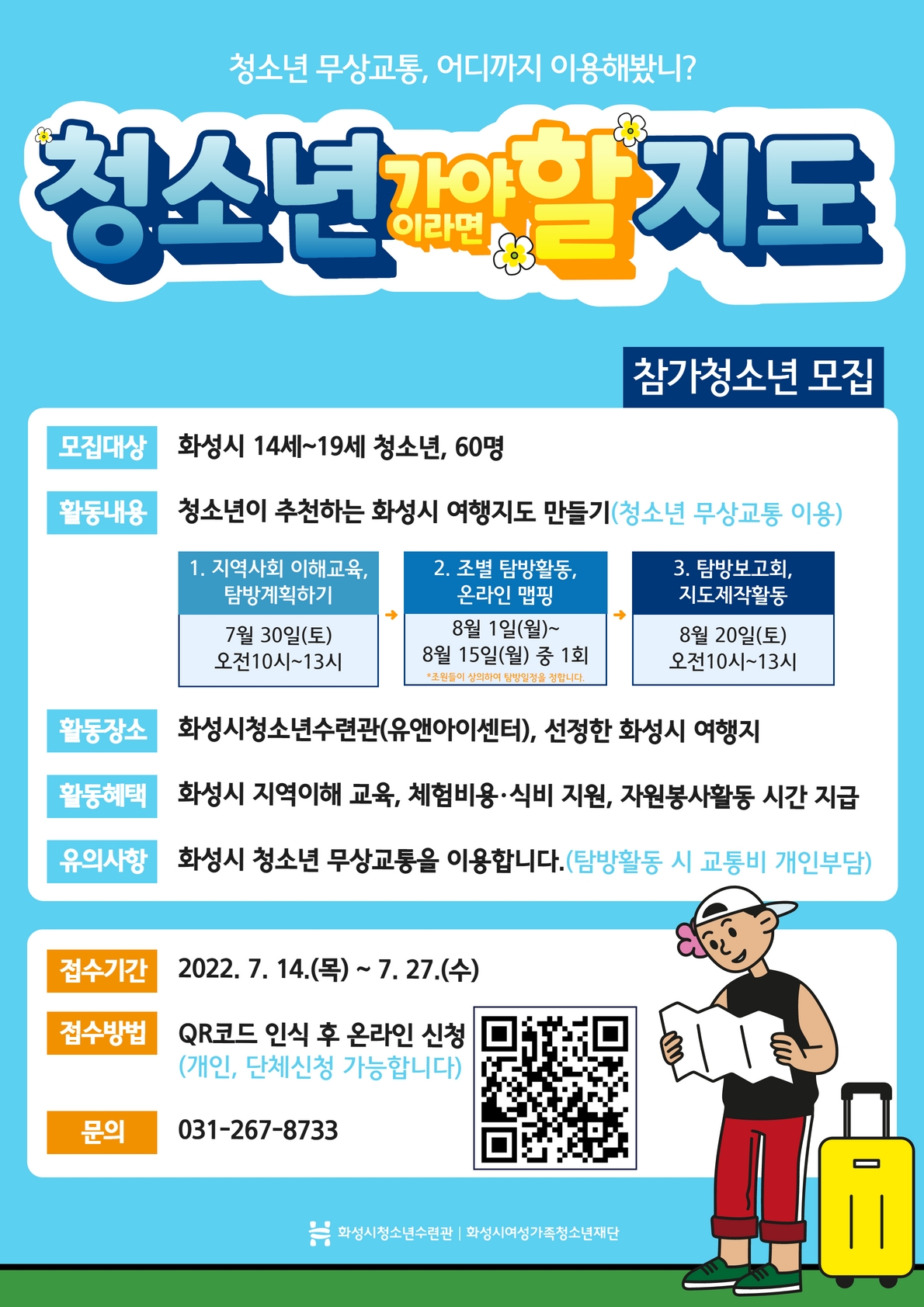 ○ 모집대상 : 화성시 14세~19세 청소년, 60명 ○ 활동내용 : 청소년이 추천하는 화성시 여행지도 만들기 ○ 활동일정 - 7월 30일(토) 오전 10시~13시 : 지역사회 이해교육, 탐방계획하기 - 8월 1일(월)~8월 15일(월) : 조별 탐방활동, 온라인맵핑 - 8월 20일(토) 오전 10시~13시 : 탐방보고회, 지도제작활동