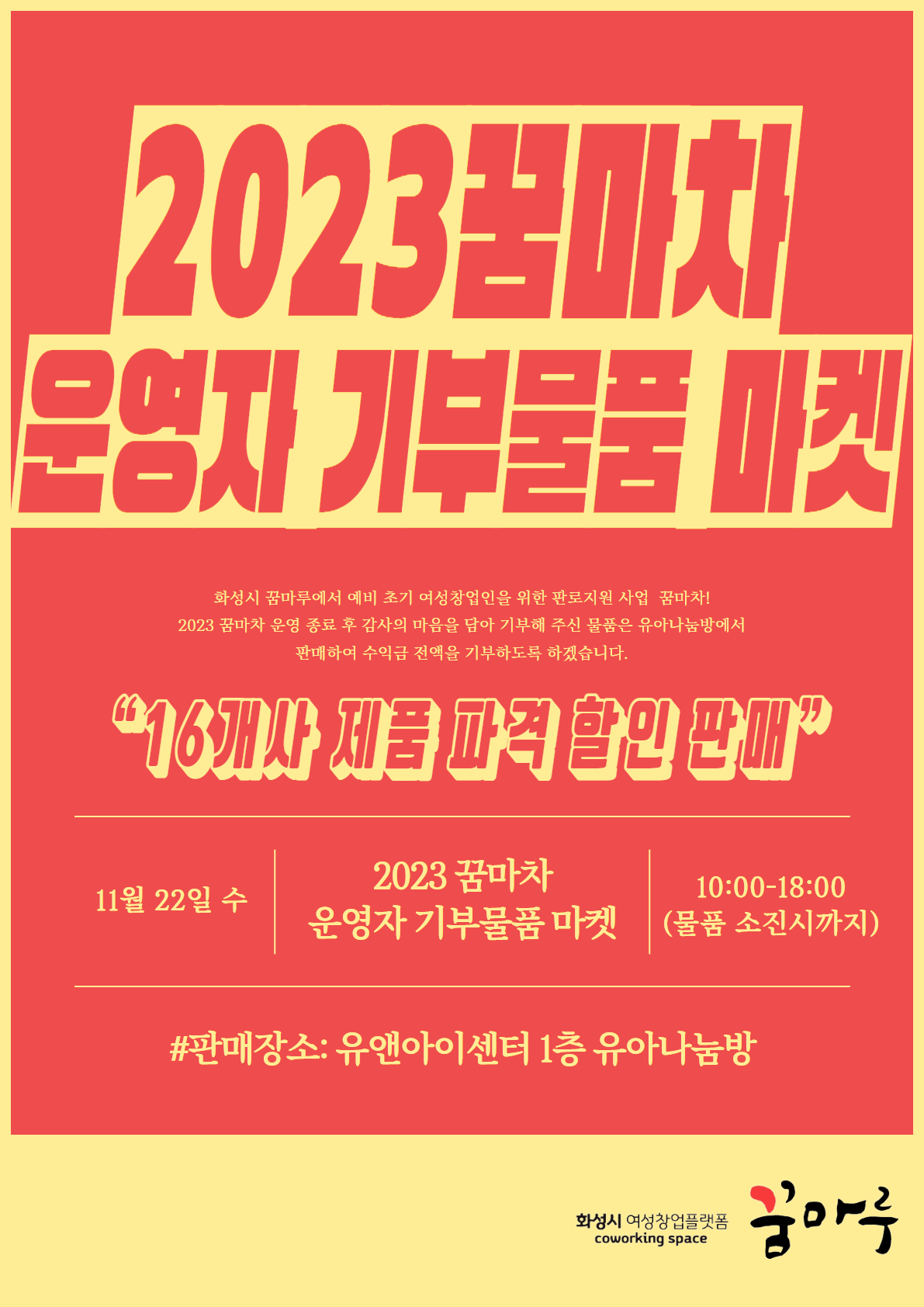 [화성시 꿈마루] 2023꿈마차 운영자 기부물품 마켓 경기 거주 여성창업인을 위한 ‘화성시 여성창업플랫폼 꿈마루’에서 예비?초기 창업자의 판로를 지원하기 위한 사업으로 2019년부터 운영하고 있는 ‘꿈마차’ 사업 2023년에도 창업의 꿈을 펼치기 위해 16명의 꿈마차 운영자가 선발되어 올 한해 동안 운영을 진행했습니다. 꿈마차 운영 종료 후 16개사 꿈마차 대표님들이 기부해 주신 물품은 ‘꿈마차 운영자 기부물품 마켓’을 통해 판매된 수익금 전액은 화성시사회복지협의회에 기부하고 있습니다. 파격 할인율이 적용된 좋은 가격으로 제품 구매도 하고 연말 기부 행사에도 참여할 수 있는 의미 있는 소비에 동참하시겠습니까? “Yes” <2023꿈마차 운영자 기부물품 마켓> 행사일시: 2023.11.22.수, 10:00~18:00 (제품 소진시까지) 판매장소: 유앤아이센터 1층 유아나눔방 앞 판매물품: 16개사 제품 총 164개