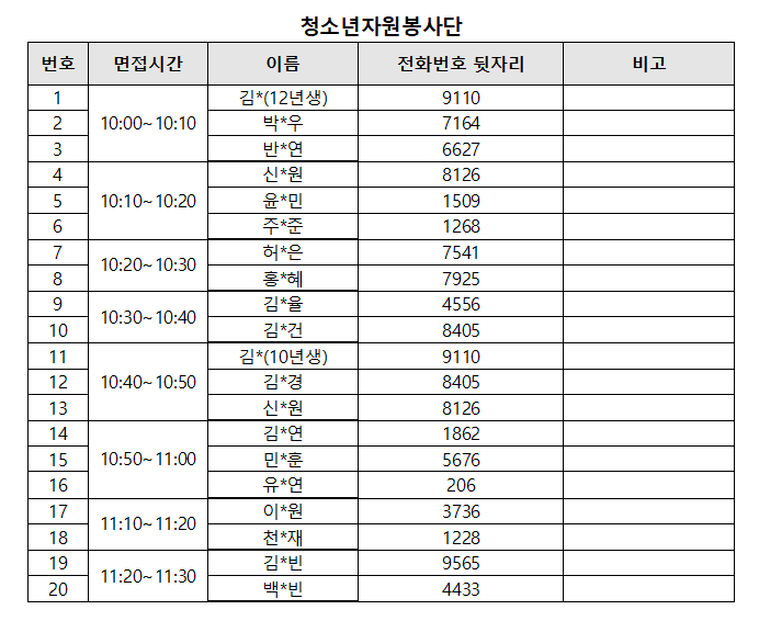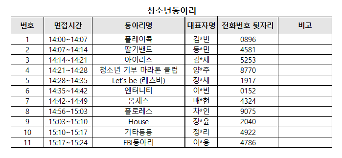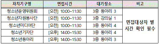 □ 청소년동아리 [담당자: 031-267-8857] *청소년동아리 면접은 기장(단장), 부기장(단장) 2인 동반면접으로 진행 *면접시간: 14:00~15:30 [대상자별 20분전 도착] *면접대기장소: 3층 동아리3