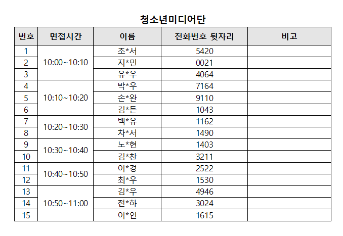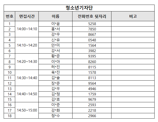 □ 청소년기자단 [담당자: 031-267-8856] *면접시간: 14:00~15:30 [대상자별 20분전 도착] *면접대기장소: 3층 동아리4