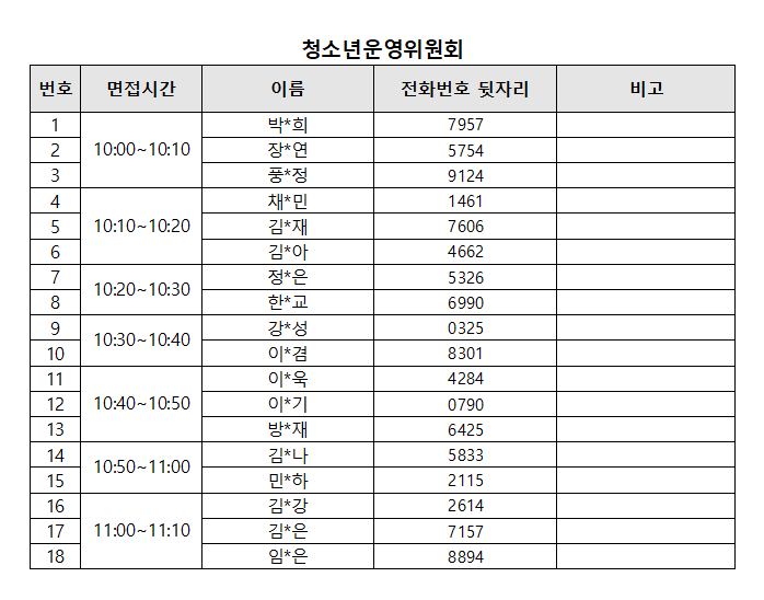 *면접 상황에 따라 면접 시간이 변동될 수 있음. *2025년 청소년참여자치기구 면접은 연임/신규 상관없이 전원 진행 *면접시간 및 참석 불가에 따른 사항은 개별 담당자 연락 요망(이하 자치기구별 표기) □ 청소년운영위원회 [담당자: 031-267-8854] *면접시간: 10:00~11:30 [대상자별 20분전 도착] *면접대기장소: 3층 동아리3 □ 청소년자원봉사단 [담당자: 031-267-8852] *면접시간: 10:00~11:30 [대상자별 20분전 도착] *면접대기장소: 3층 강의실1 □ 청소년미디어단 [담당자: 031-267-8855] *면접시간: 10:00~11:30 [대상자별 20분전 도착] *면접대기장소: 3층 동아리4