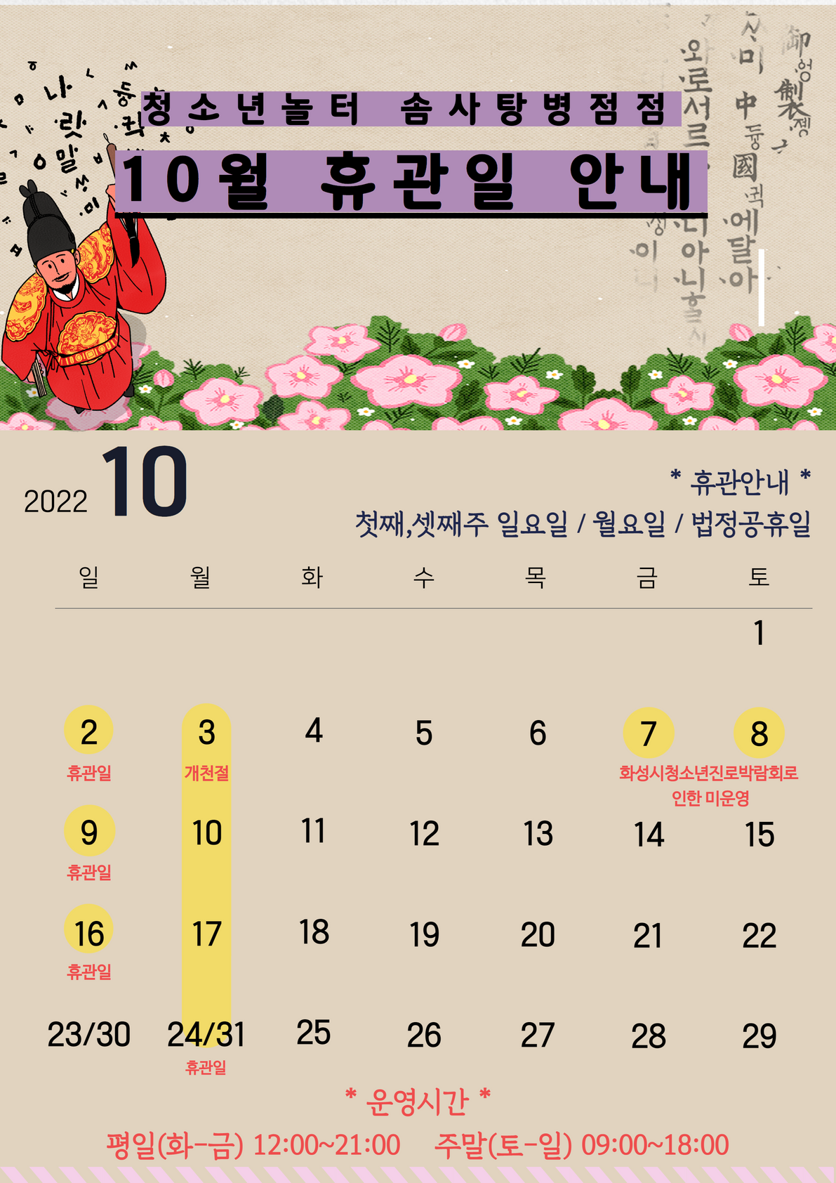 [화성시청소년수련관] 청소년놀터 병점점 10월 휴관일 안내