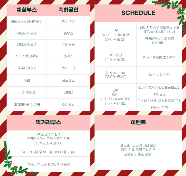 * 올해의 꿈틀 콘셉트는 크리스마스입니다. 크리스마스 의상, 소품을 착용하신 분에게는 먹거리부스 1회 이용권을 드립니다.