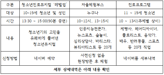 1. 청소년진로뮤지컬 ‘레벨업’? “무엇이든 꿈꾸고, 무엇이든 될 수 있는 청소년들” 자존감을 갖고 자신의 색깔을 찾기 위해 무엇이든 꿈궈라. - 공연시간: 13:30~15:00 - 공연장소: 화성아트홀(유앤아이센터 1층) - 관람대상: 10~19세 청소년 및 학부모, 400명 선착순 - 신청방법: 온라인시스템을 이용한 사전예약(300명), 잔여석 현장입장가능 - 참여링크: https://booking.naver.com/booking/6/bizes/656464 - 문의: 031-267-8847, 8857 - 세부내용: 스스로를 평범하고 보잘 것 없다고 생각하는 주인공이 소원을 이뤄주는 어플을 통해 동경하는 능력을 얻게 되는 판타지적인 요소를 넣어 청소년기의 고민을 유쾌하게 풀어낸 청소년뮤지컬