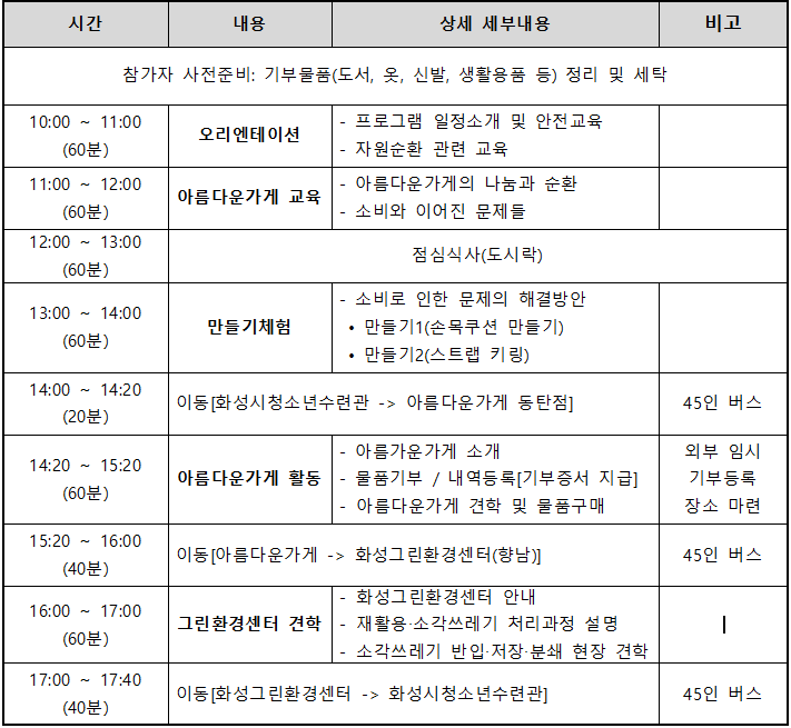 *기부물품은 세탁 및 정리 필요, 참가자는 당일 현장에 물품 지참하여 참가바랍니다.