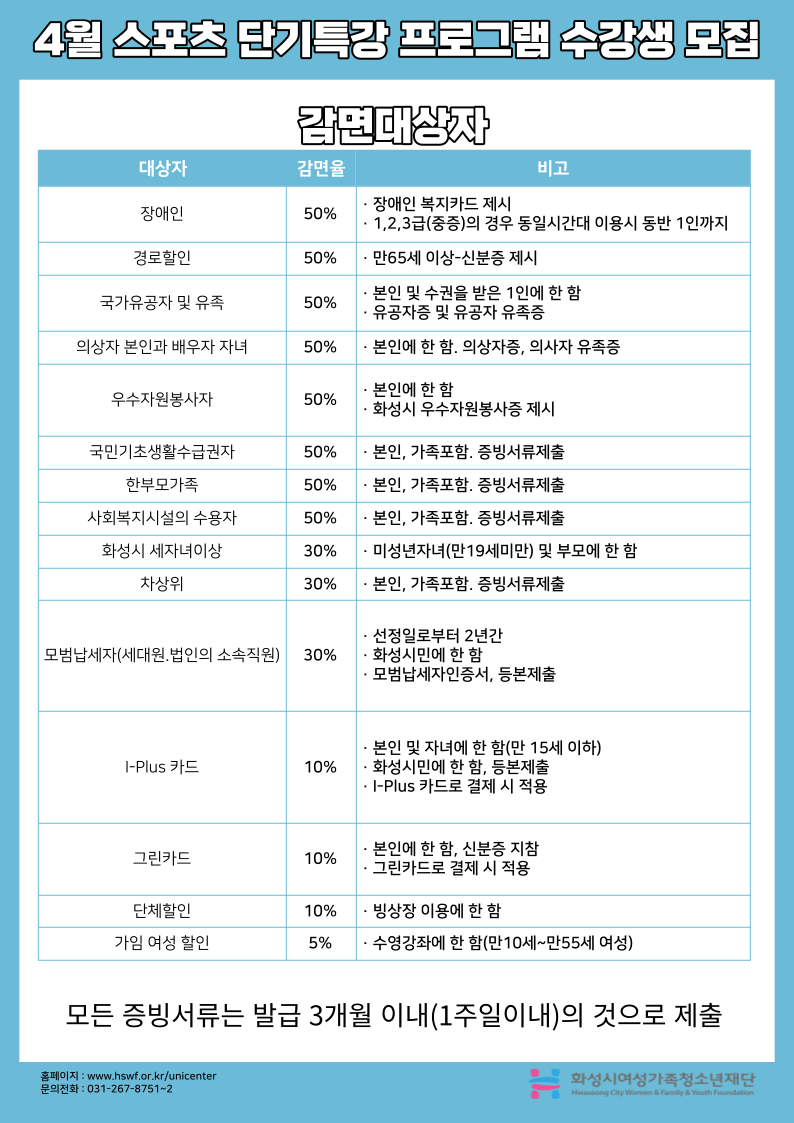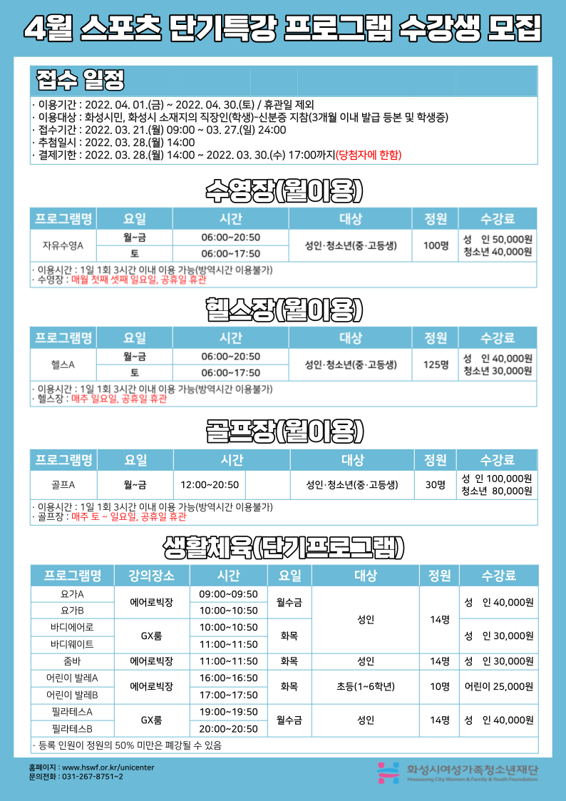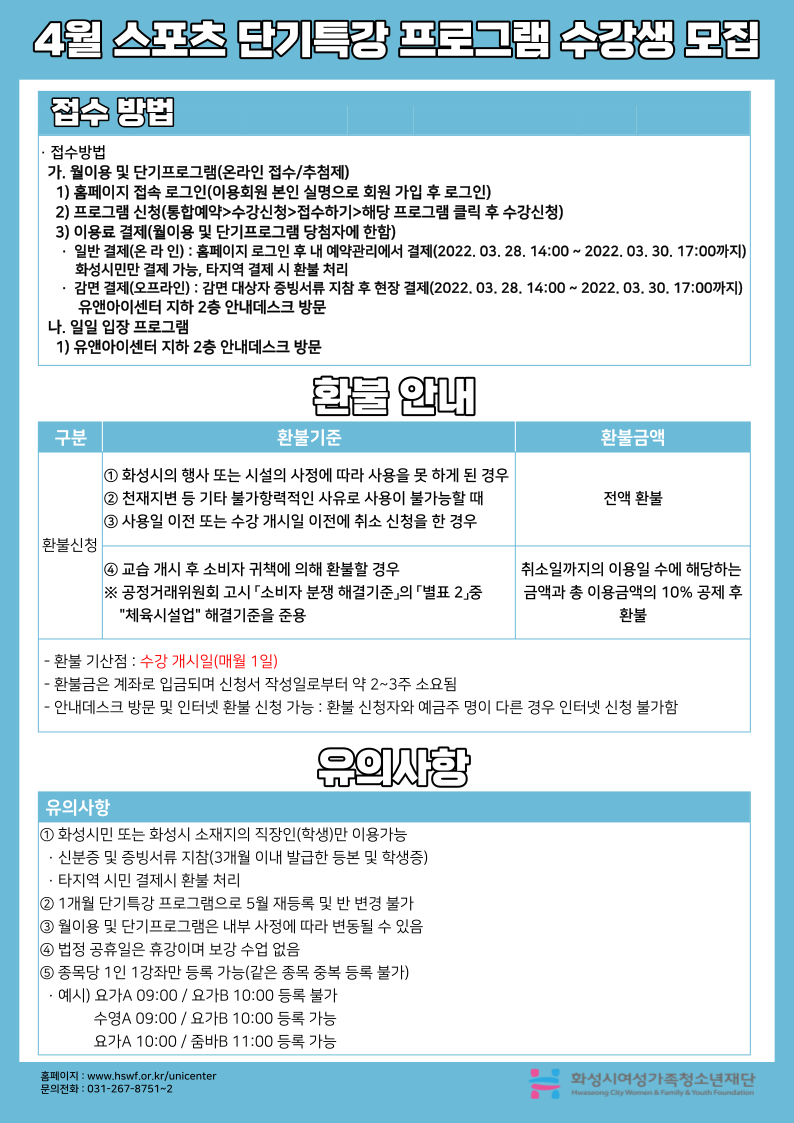 | 제목 | [유앤아이센터]2022년 4월 스포츠 단기특강 프로그램 수강생 모집 | ||