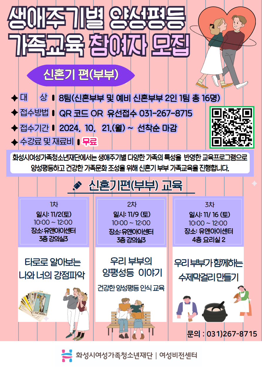 제목 [화성시여성비전센터] 생애주기별 양성평등 가족교육(신혼기편) 참여자 모집