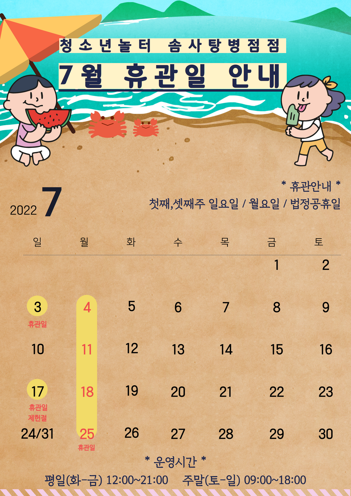 [화성시청소년수련관] 청소년놀터 병점점 7월 휴관일 안내