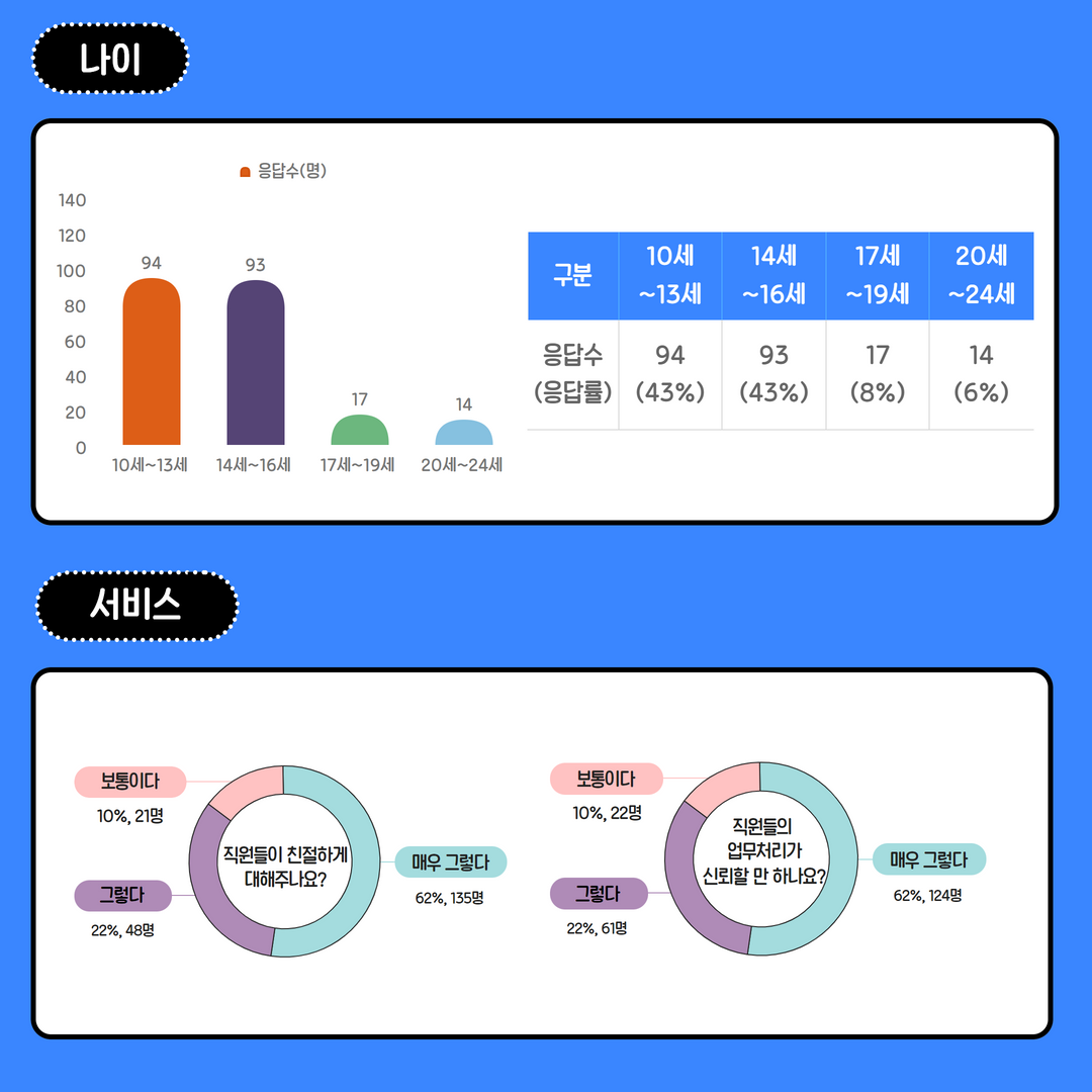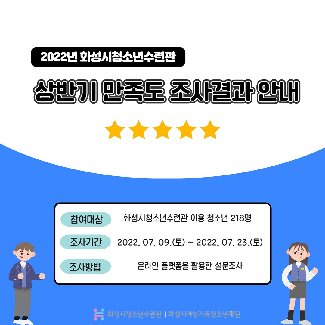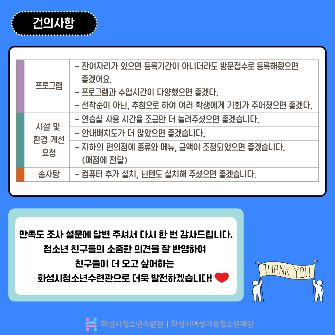 제목 [화성시청소년수련관] 2022년 상반기 화성시청소년수련관 만족도조사 결과 운영센터 유앤아이센터 작성일 2022년 8월 2일 18시 28분 조회수 1,276 #화성시청소년수련관#2022 상반기 만족도조사_결과 2022.07.09.(토)~07.23.(토)까지 진행한 만족도조사결과를 알려드려요.응답해준 모든 친구들 모두 고맙고더 발전하는 화성시청소년수련관이 될게요! 목록보기