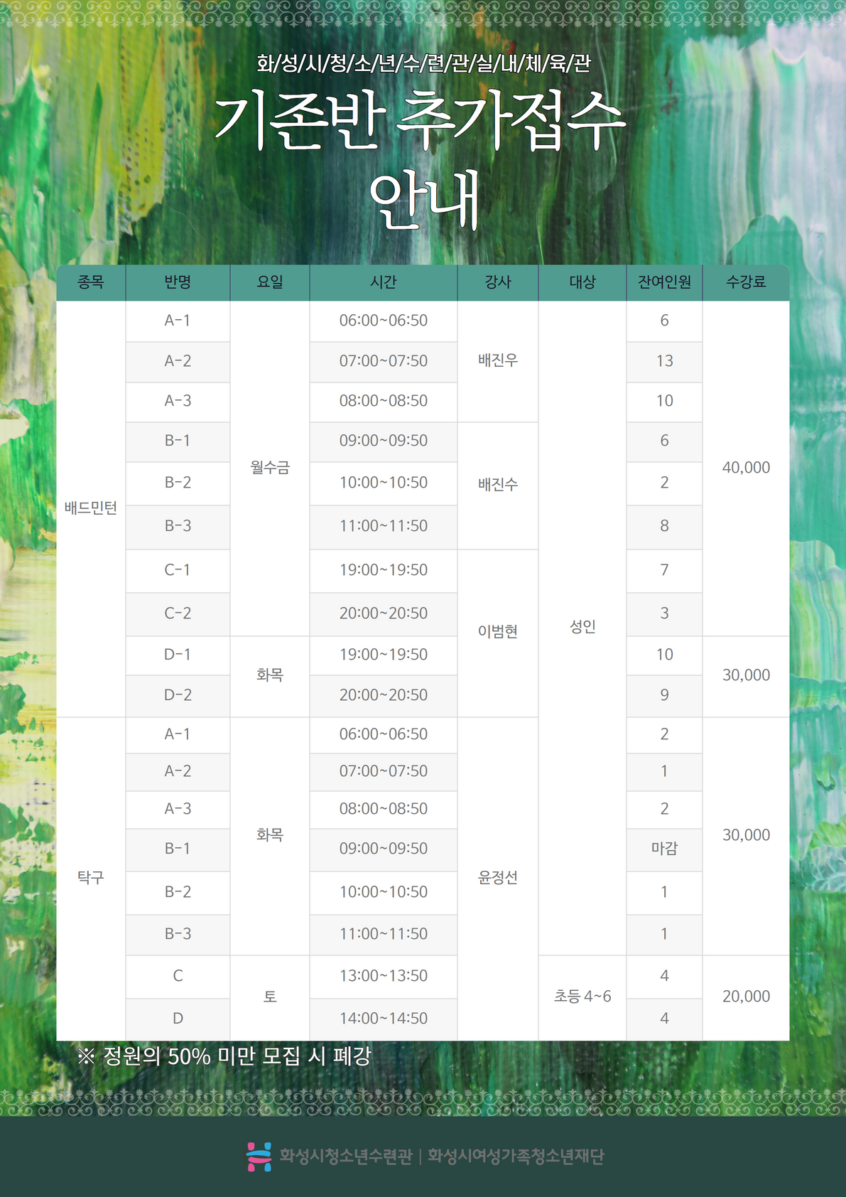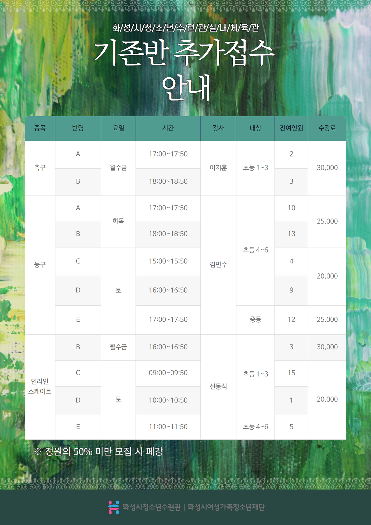 제목 [화성시청소년수련관] 7월 실내체육관 프로그램 신규 및 추가접수 안내(정정)