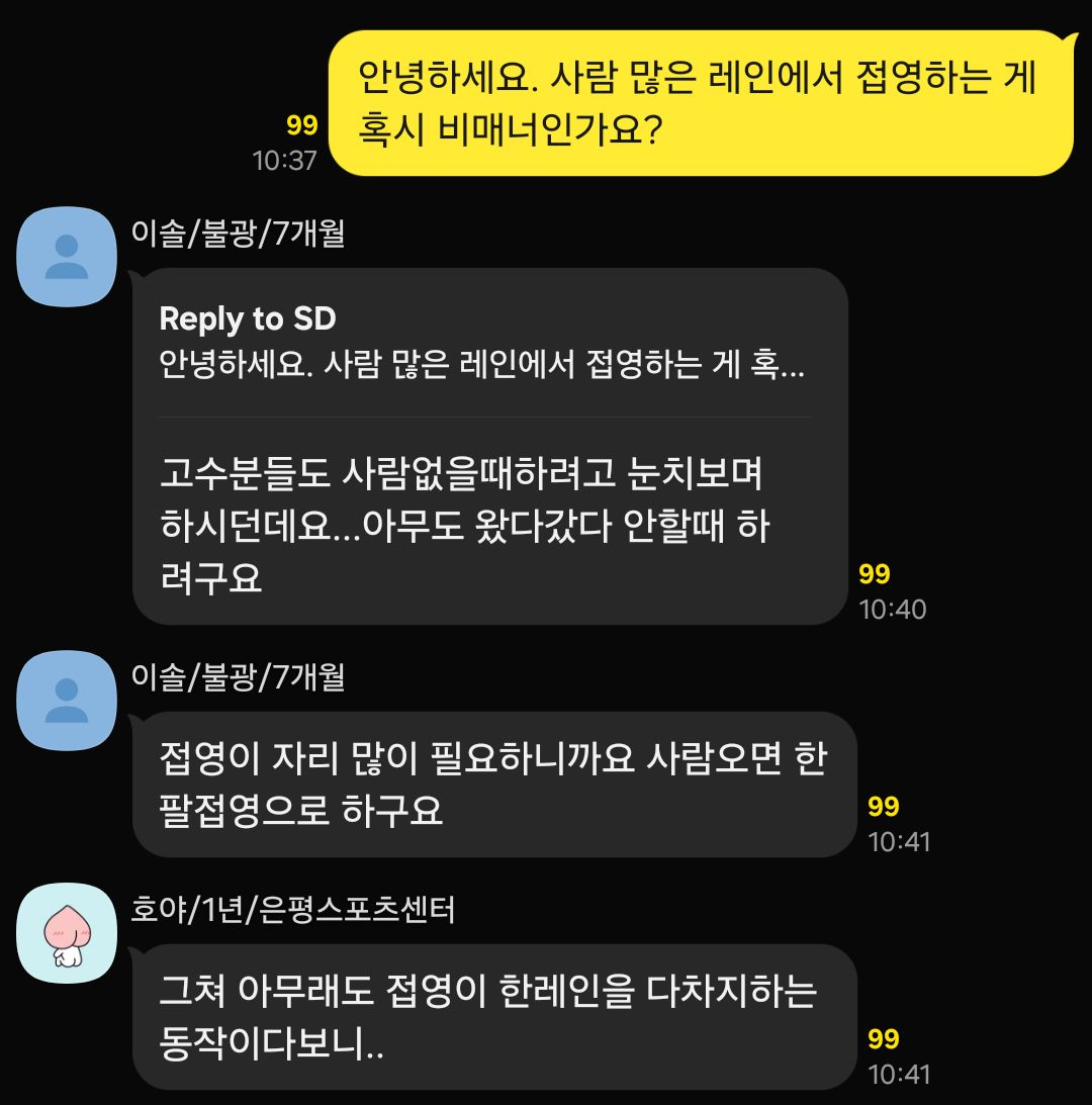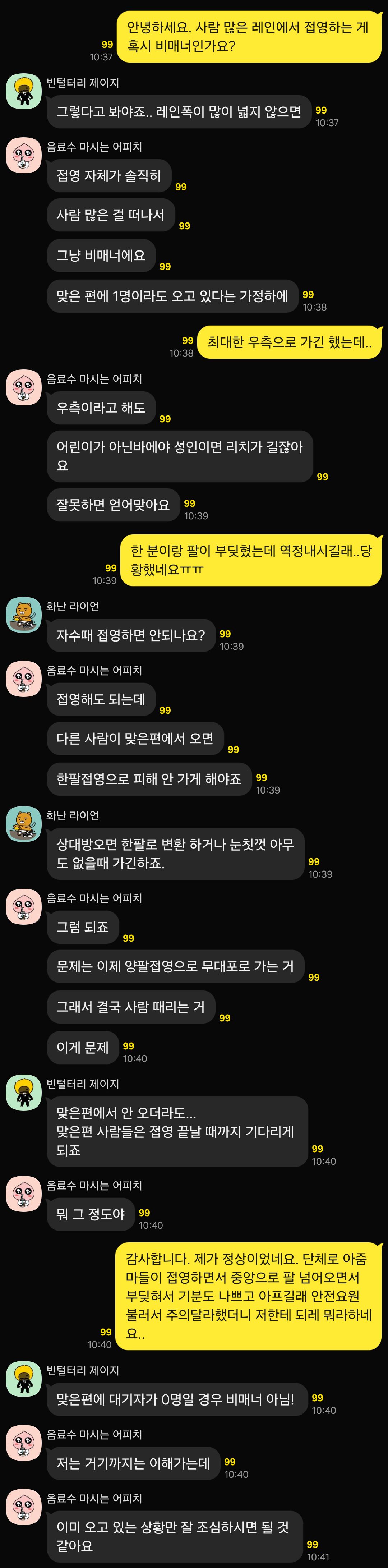 사람이 많이 이용하는 레인에서 단체로 접영하는 게 비매너임에도 불구하고 단체로 하면 죄책감이 1/n으로 줄어드는지 아무렇지 않게 중앙으로 팔이 넘어오며 해대는데 안전요원들은 되도록 사람 많을 때는 한팔 접영을 하라고 주의주면 좋겠네요. 수영하다가 손등이 부딪혔는데 안전요원한테 주의달라고 요청하니 되레 소리 지르지 마라는 얼토당토 않는 소리를 들었네요.