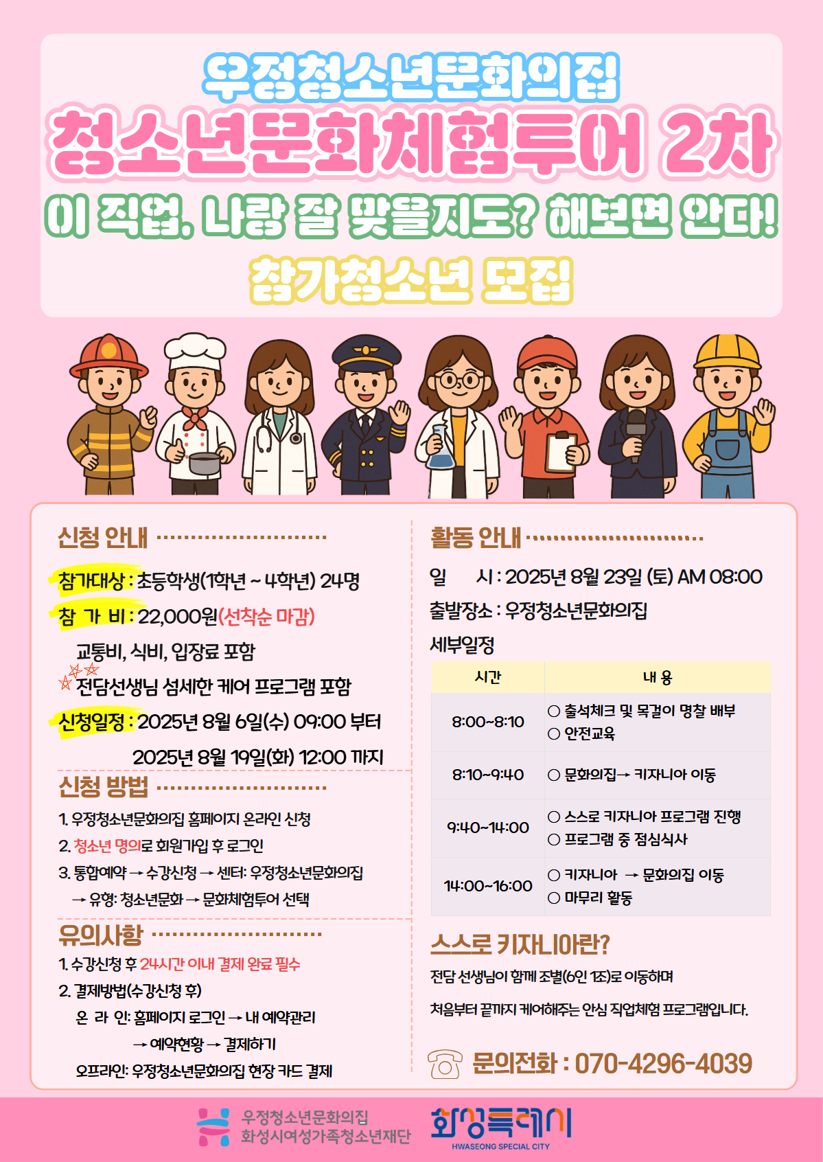 우정청소년문화의집 청소년문화체험투어 2차 “직접 체험하는 진짜 직업의 세계! 키자니아로 떠나요!” 초등학교 1~4학년 청소년을 위한 특별한 하루! 서울 키자니아 직업체험 테마파크로 떠나는 우정청소년문화의집의 2025년 청소년문화체험투어 2차 참가자를 모집합니다 스스로 키자니아란? 단순 자유입장이 아닙니다! 전담 선생님이 6인 1조로 조별 이동하며, 아이 한 명 한 명을 옆에서 직접 케어하는 안전하고 체계적인 직업체험 프로그램입니다. 처음 가는 친구도 걱정 없이 참여할 수 있어요! 왜 특별할까요? 전문 선생님이 함께 이동하며 처음 가는 아이도 안심! 직접 체험하는 160여 개 직업, 진짜처럼 생생한 활동 맛있는 점심 제공 우정에서 서울까지 왕복 차량 포함 지금 바로 신청하세요! 운영 안내 1. 일시: 2025년 8월 23일(토) 08:00 ~ 16:00 2. 장소: 키자니아 서울 (송파구 올림픽로 240) 4. 대상: 초등학교 1~4학년 청소년 24명 5. 참가비: 22,000원 (점심식사 + 왕복차량 + 입장료 포함) 6. 신청기간: 8월 7일(수) ~ 8월 19일(화) ※ 선착순 24명 마감! 신청방법 1. 우정청소년문화의집 홈페이지 온라인 접수 2. 청소년명의로 회원가입 후 로그인 3. 통합 예약 -> 수강신청 -> 센터: 우정청소년문화의집 -> 유형: 충소년문화 -> 문화체험투어 선택 유의사항 수간신청후 24시간 이내 결제 완료 결제방법(수강신청 후) 온라인: 홈페이지 로그인 -> 내 예약관리 -> 예약현황 -> 결제하기 오프라인: 우정청소년문화의집 현장 카드결제 우정읍에서 출발해 서울 키자니아에서 우리 아이의 꿈을 만나는 하루! 놓치지 마세요. 선착순 24명만 참여 가능합니다! 문의: 070-4296-4039 (우정청소년문화의집 청소년사업 담당자) |