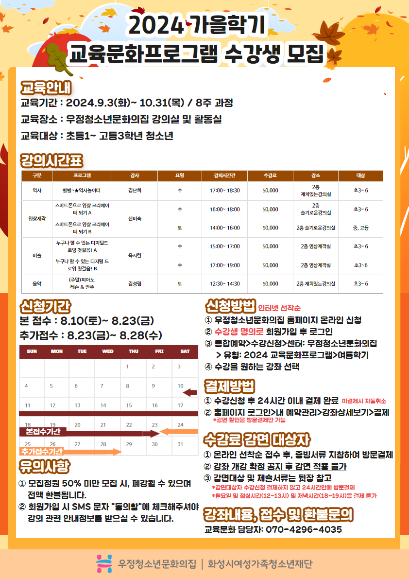 2024년 가을학기청소년교육문화프로그램을 모집안내드립니다.