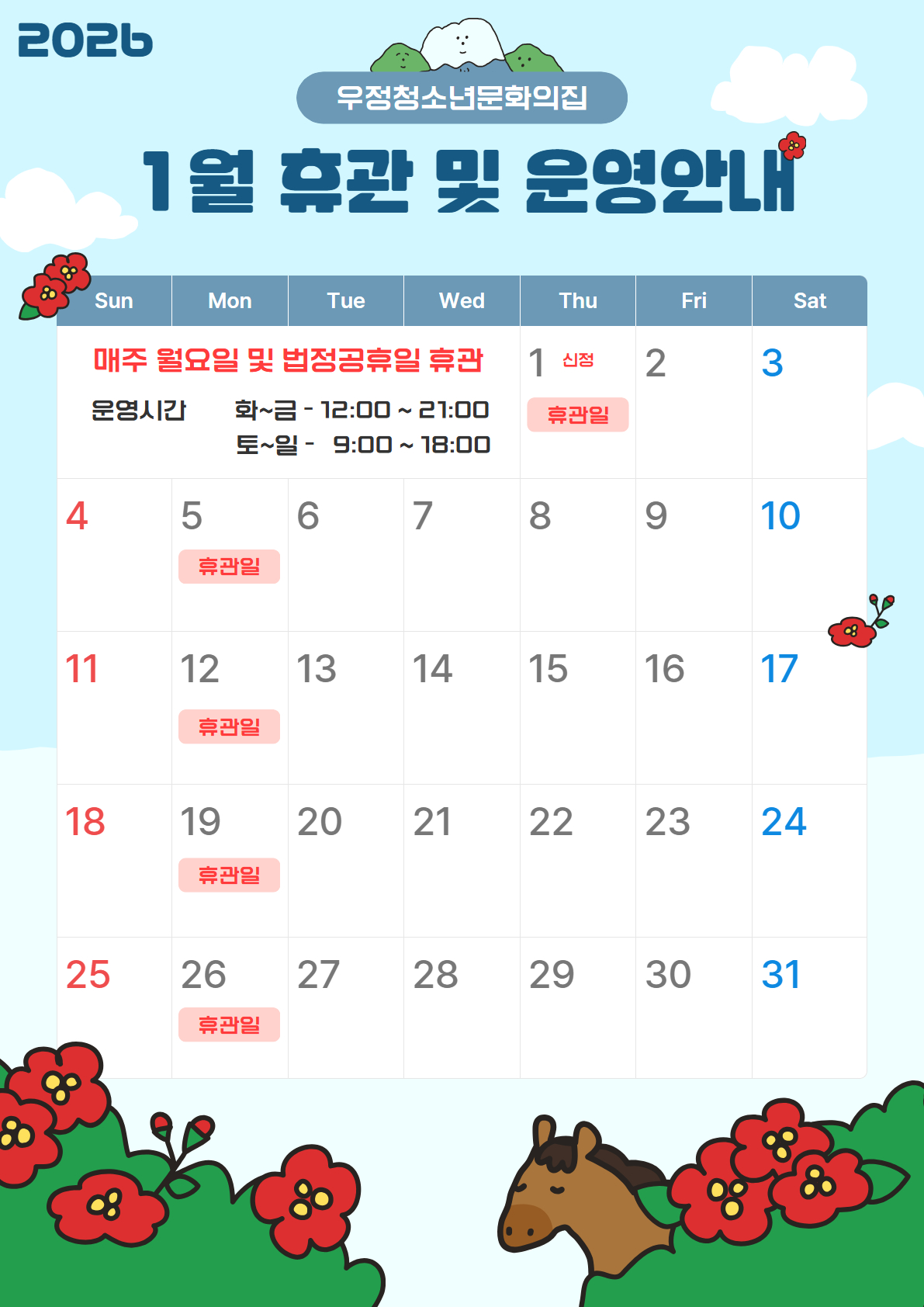 제목 [우정청소년문화의집]1월 휴관안내 작성일 2026년 1월 3일 14시 57분 조회수 45 첨부 파일 아이콘[우정청소년문화의집] 2026년 1월 휴관일정.jpg (587.4KB)다운로드 아이콘 목록보기