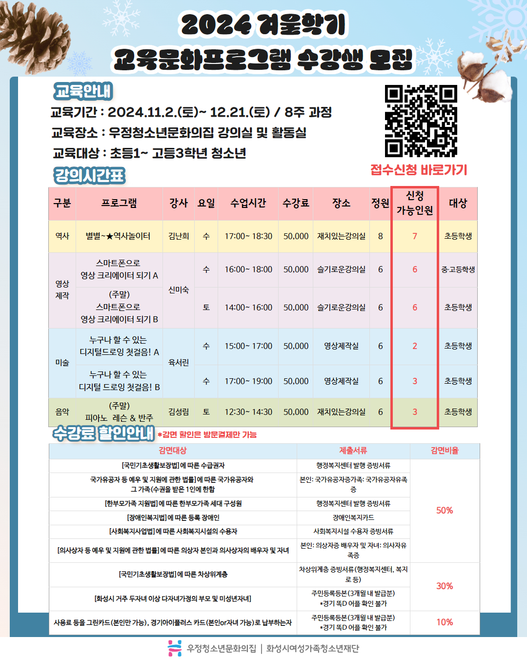 안녕하세요. 우정청소년문화의집입니다. 2024년 교육문화프로그램 잔여석 현황입니다! 내일까지 신청가능하오니 신청부탁드립니다!
