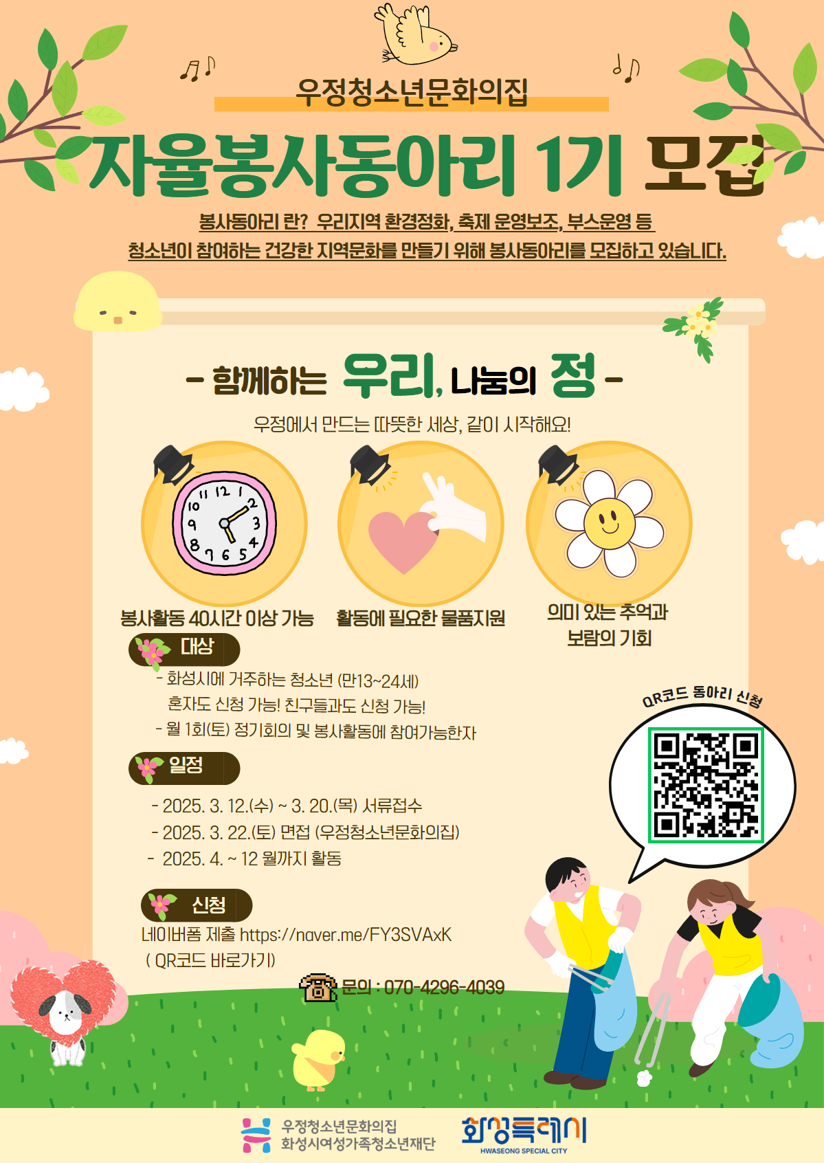 우정청소년문화의집에서 2025년 자율봉사동아리 신규 동아리원을 모집하고 있습니다. 1. 화성시에 거주하는 청소년(만13~24세) 지원가능! (혼자, 또는 친구와 같이) 2. 일정 - 2025.3. 12.(수) ~ 3. 20. (목) 서류접수 - 2025. 3 .22(토) 면접 3. 신청 - 네이버폼 (https://naver.me/FY3SVAxK) 또는 포스터 QR코드 신청 |