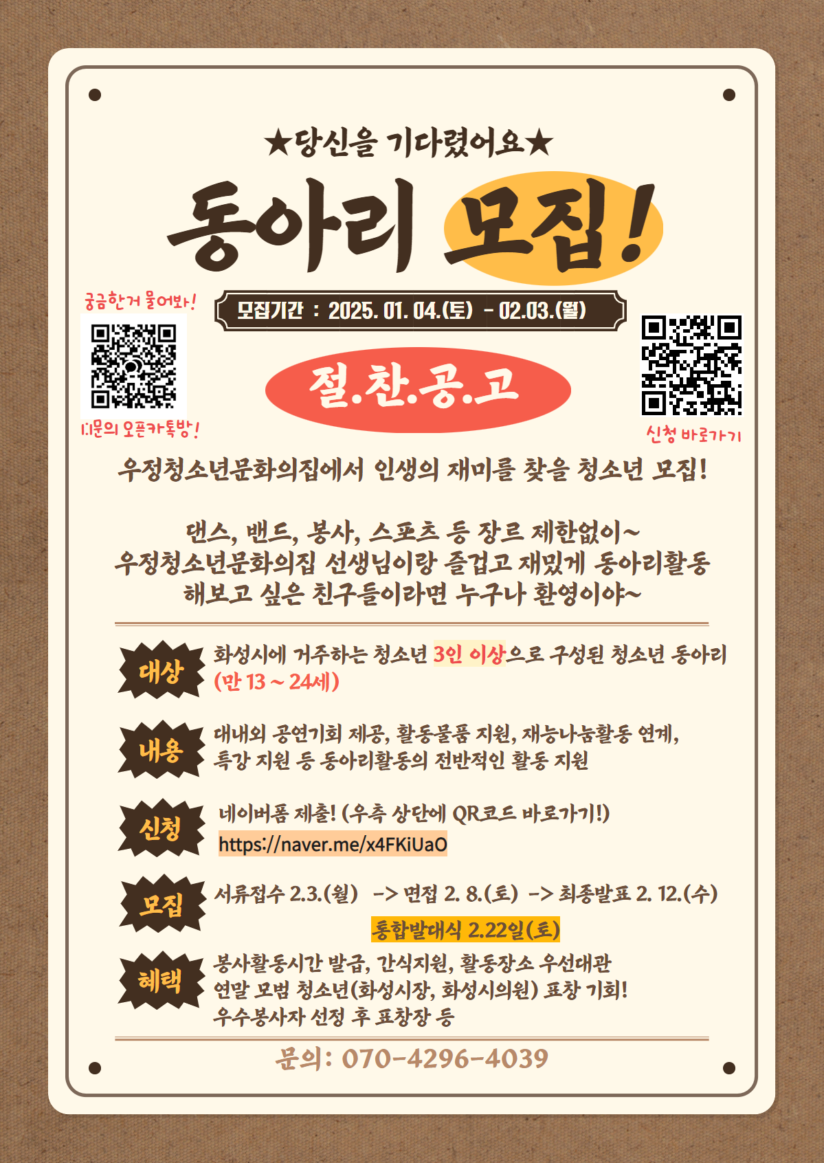 2025년 우정청소년문화의집 청소년 동아리 모집 우정청소년문화의집에서 인생의 재미를 찾을 청소년을 아래와 같이 모집합니다. 대상: 화성시에 거주하는 청소년 3인 이상으로 구성된 청소년 동아리(만13~24세) 내용: 대내외 공연기회 제공, 활동물품 지원, 재능나눔활동 연계, 특강 지원 등 동아리활동의 전반적인 활동 지원 신청: 네이버폼 제출 [http://naver.me/x4FKiUaO], 아래 QR코드로 신청 모집: 서류접수 2.3(월) → 면접 2.8(토) → 최종발표2.12.(수) 통합발대식 2.22.(토) 혜택: 봉사활동시간발급, 간식지원, 활동장소 우선대관, 연말 모범 청소년(화성시장, 화성시의원)표창 기회, 우수봉사자 선정 후 표차장 등 문의: 070-4296-4039(우정청소년문화의집)