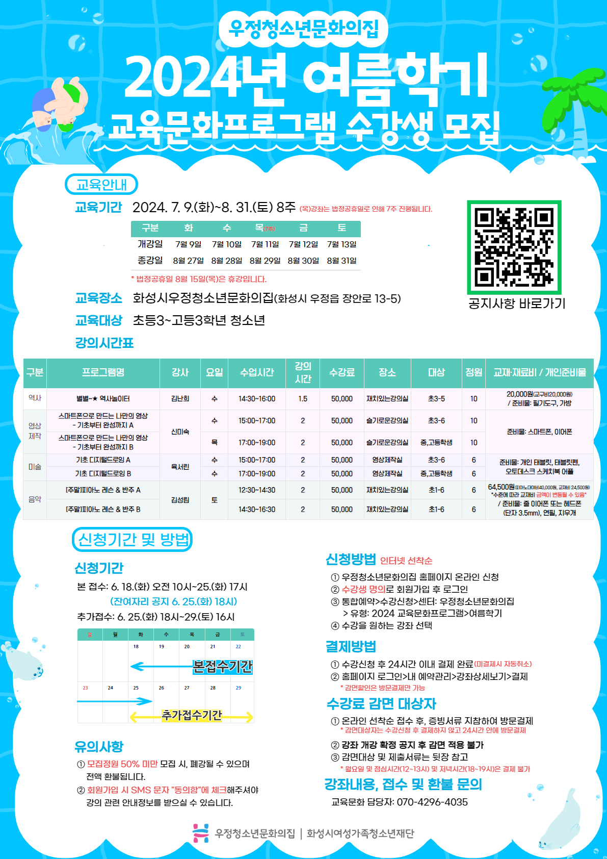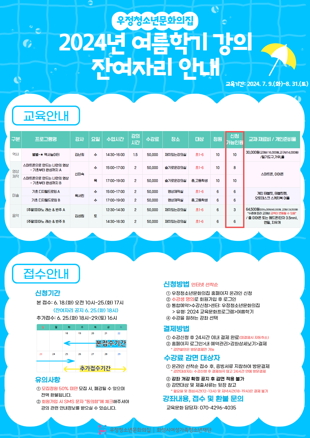 2024 여름학기 청소년교육문화프로그램 일부 대상 연령 변경 및 잔여 좌석을 다음과 같이 안내 드립니다.