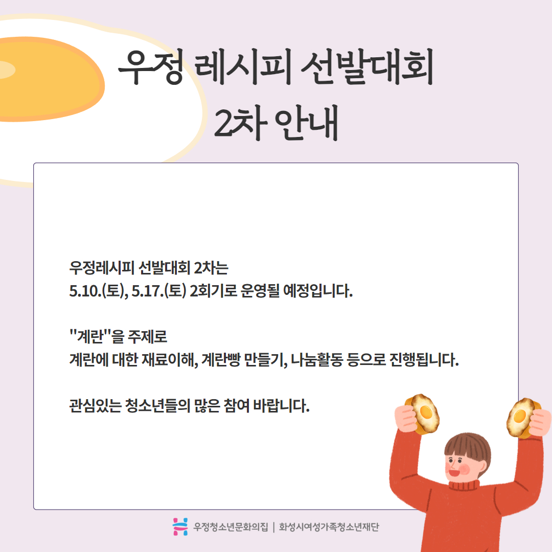 치즈를 이용해 브라질 치즈빵인 "뻥떼께쥬"를 만들었어요. 밀가루가 전혀 들어가지 않은 건강한 빵이 완성되었답니다! 점심을 먹고 오후시간에는 각자 치즈로 만든 레시피를 구상해보는 시간을 가졌어요! 미니치즈피자, 체다치즈 과자, 투움바 라면, 치즈 토스트, 라이스페이퍼 치즈스틱 등 평소에 청소년들이 쉽게 접할 수 있는 재료로 쉽게 만들 수 있는 레시피가 나왔어요! 점심을 먹고 오후시간에는 각자 치즈로 만든 레시피를 구상해보는 시간을 가졌어요! 미니치즈피자, 체다치즈 과자, 투움바 라면, 치즈 토스트, 라이스페이퍼 치즈스틱 등 평소에 청소년들이 쉽게 접할 수 있는 재료로 쉽게 만들 수 있는 레시피가 나왔어요! 회의를 통해 최종 선정된 메뉴는 "미니치즈피자"였답니다! 1회기에서 선정된 메뉴인 "미니 치즈피자"를 만들어보는 시간을 가졌어요! 강사선생님 없이 직접 구상한 재료와 레시피로 만들었답니다. 1인당 2판의 피자를 완성하여 1층 우정카페에서 문화의집을 이용하는 청소년들에게 나눔활동까지 진행했답니다. 참가 청소년 만족도 88.9% 도출되었으며, '덕분에 요리 실력이 늘었다', '피자를 만들고 사람들에게 나눠줘서 좋았다' 등의 의견이 나왔답니다! 우정레시피 선발대회 2차는 5.10.(토), 5.17.(토) 2회기로 운영될 예정입니다. "계란"을 주제로 계란에 대한 재료이해, 계란빵 만들기, 나눔활동 등으로 진행됩니다. 관심있는 청소년들의 많은 참여 바랍니다. |