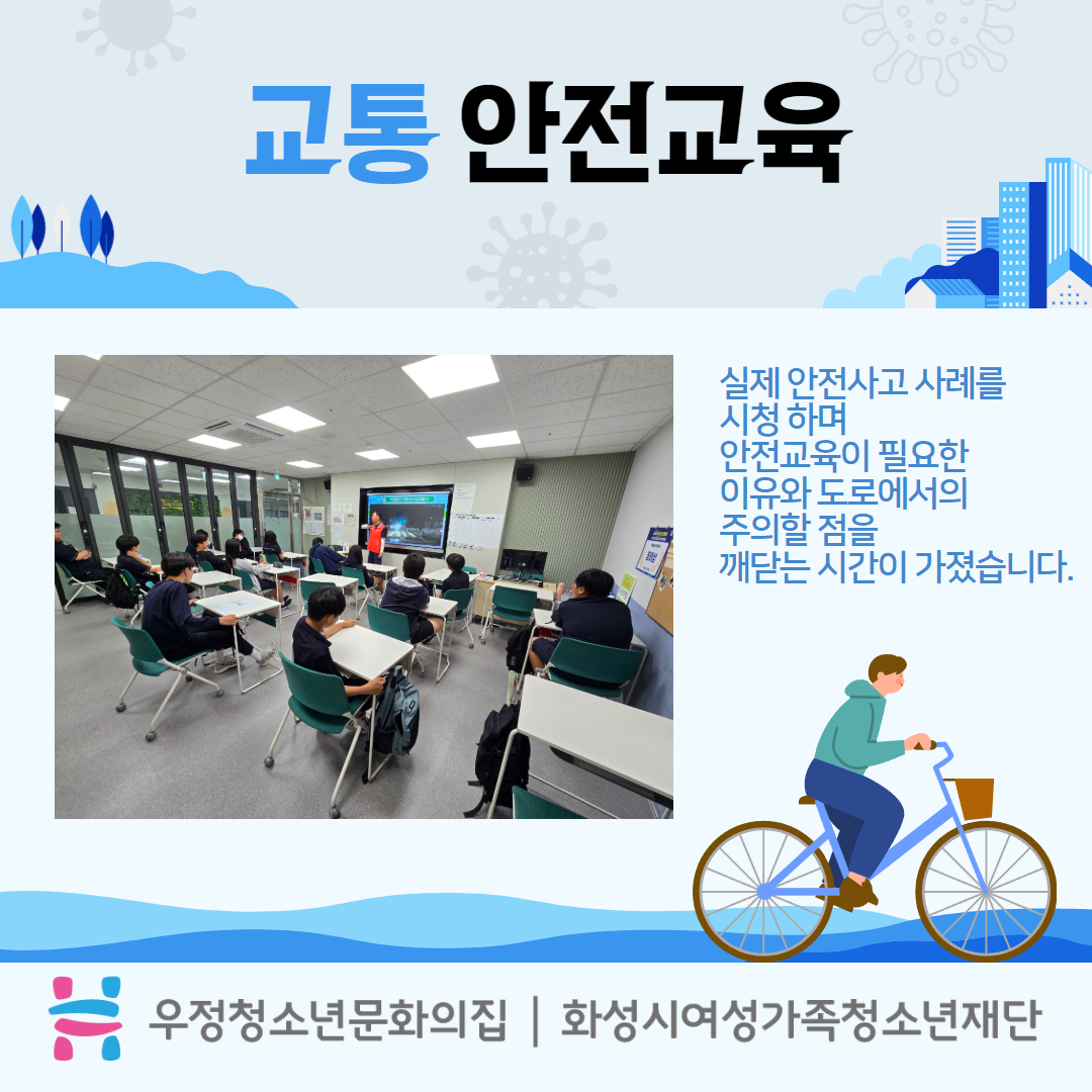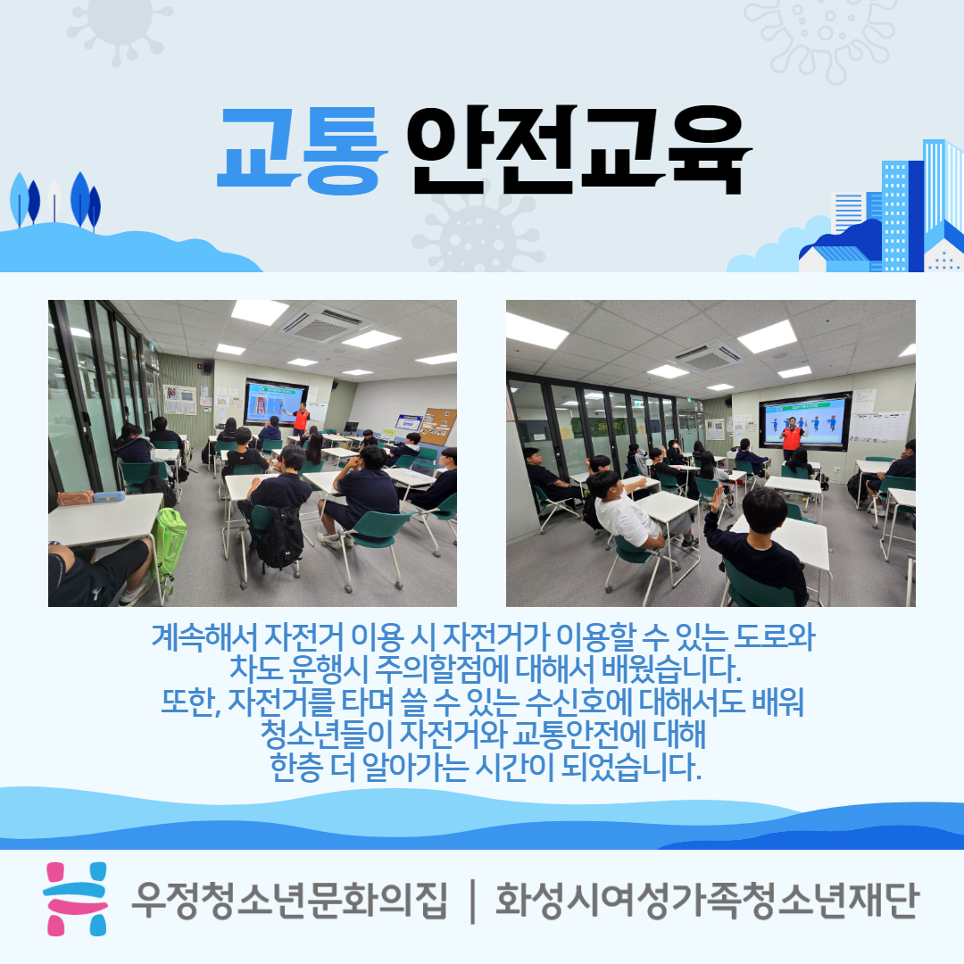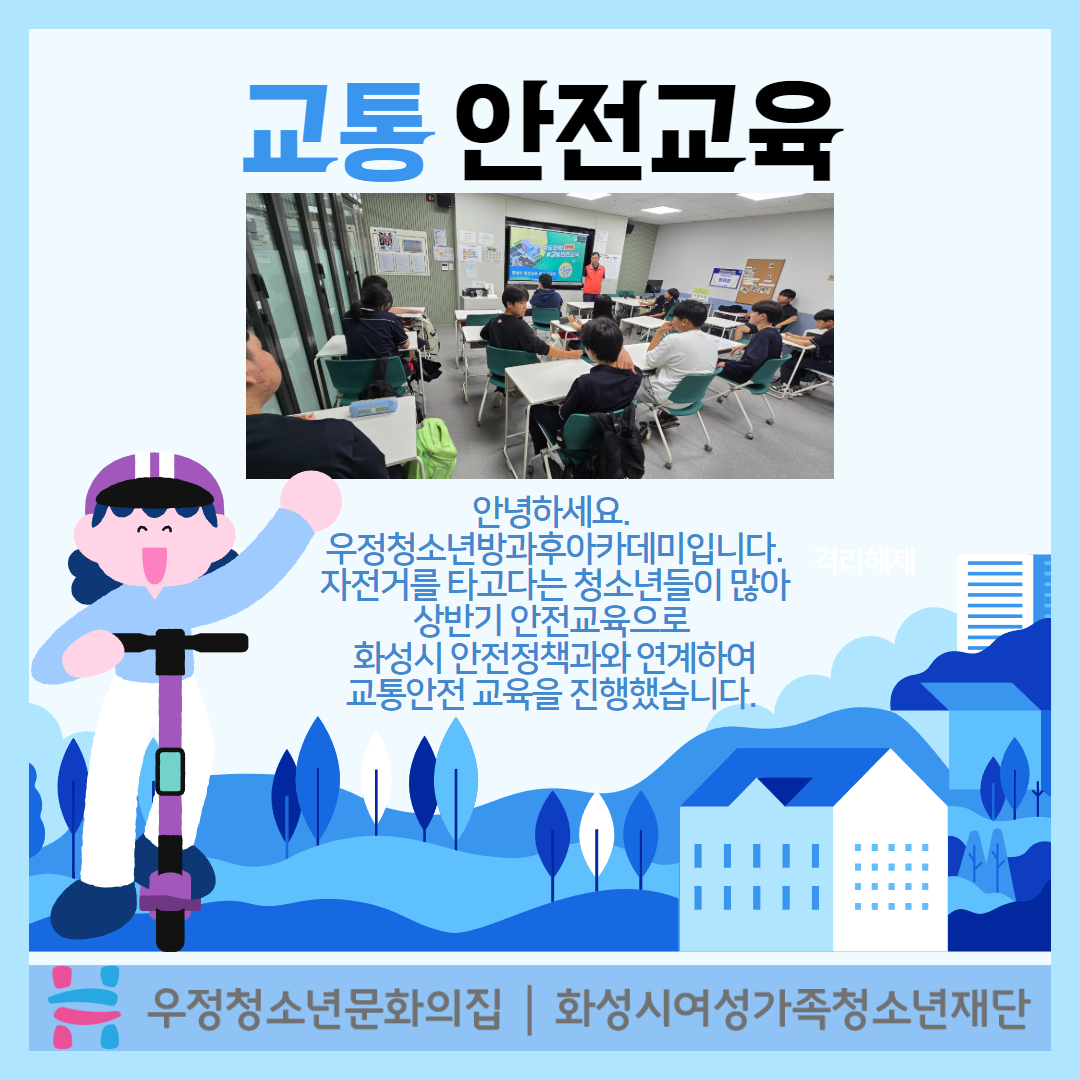 안녕하세요. 우정청소년방과후아카데미입니다. 2025년 상반기 안전교육으로 화성시청 안전정책과 안전교육팀과 연계하여 6월 13일에 교통안전 교육을 진행하였습니다. 어떤 프로그램이였는지 카드뉴스로 알아보겠습니다.