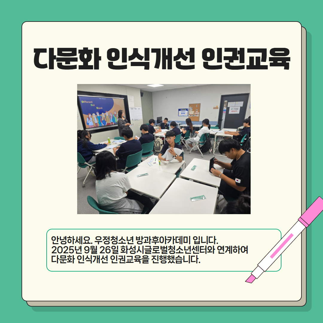 안녕하세요. 우정청소년방과후아카데미입니다. 화성시글로벌청소터센터과 연계하여 다문화 인식 개선 인권 교육을 진행했었습니다. 어떤 프로그램이였는지 카드뉴스로 알아보겠습니다.