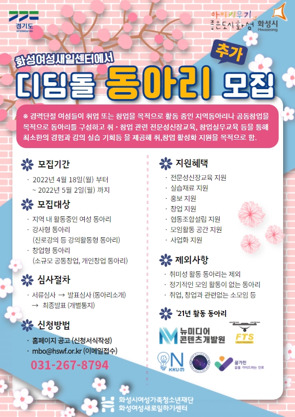 | 제목 | 경력단절여성 디딤돌 취업지원사업 참여 동아리 추가모집 (~5/2) | ||