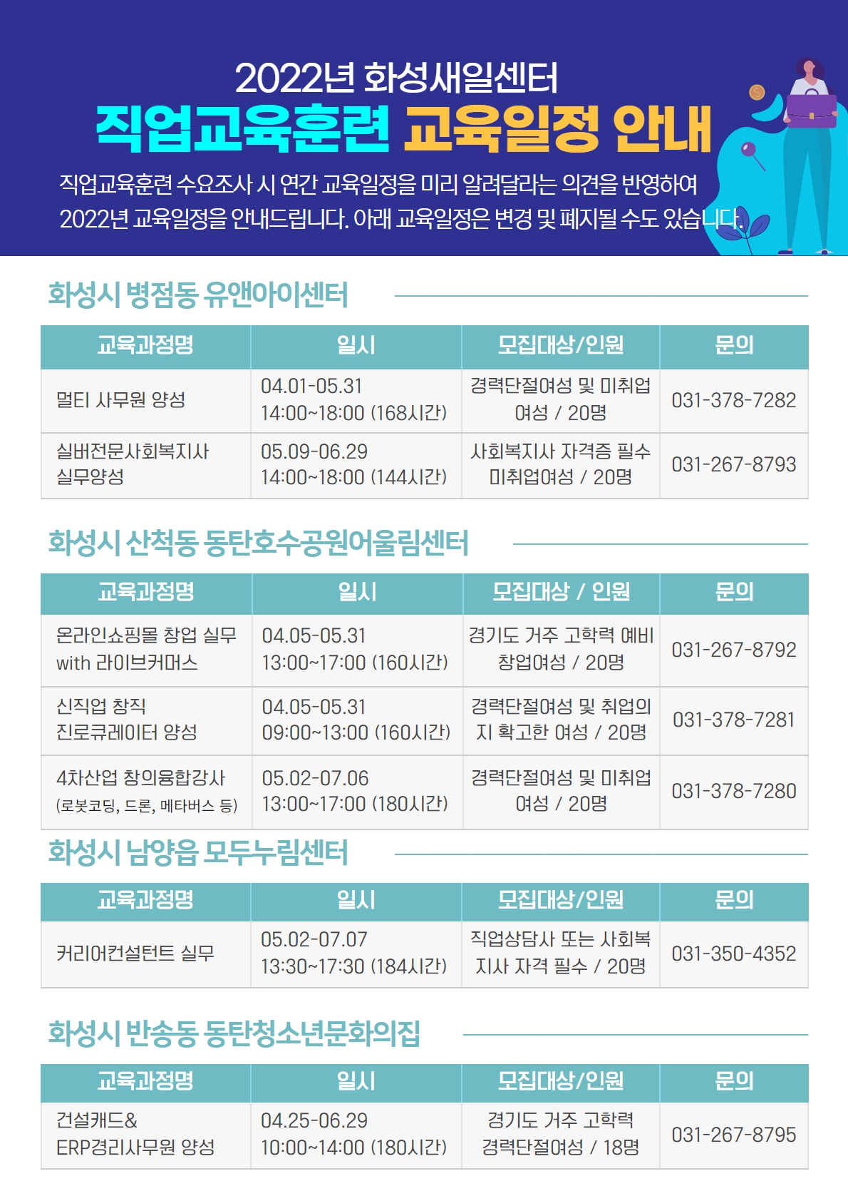 화성새일센터 2022년 직업교육훈련 연간 모집 일정입니다.
