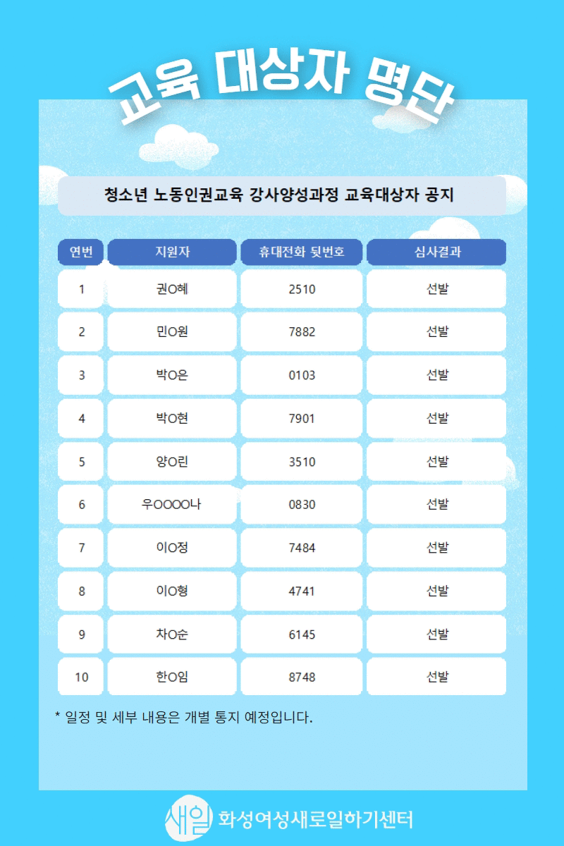 제목 [화성여성새일센터] 청소년 노동인권 강사 양성과정 2기 선발결과 안내 운영센터 화성여성새로일하기센터 작성일 2021년 8월 25일 10시 43분 조회수 1,270 ? ? 목록보기