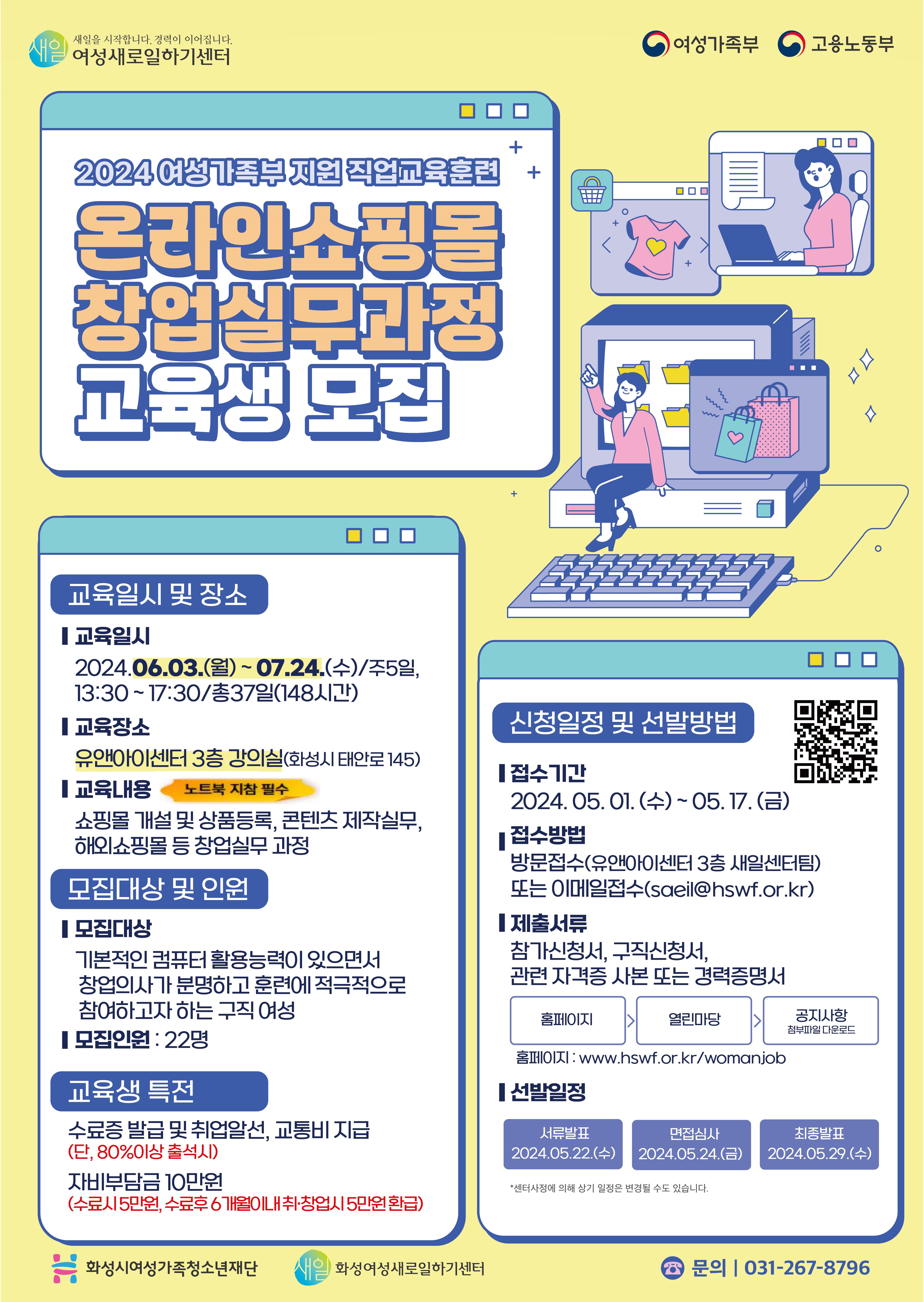 ◆ 교육일시 및 장소 -교육일시 : 2024.06.03.(월) ~ 07.24.(수)/주5일, 13:30 ~ 17:30/총37일(148시간) -교육장소 : 유앤아이센터 3층 강의실(화성시 태안로 145) -교육내용 : 쇼핑몰 개설 및 상품등록, 콘텐츠 제작실무, 해외쇼핑몰 등 창업실무 과정 (노트북 지참 필수) ◆ 모집대상 및 인원 -모집대상 : 기본적인 컴퓨터 활용능력이 있으면서 창업의사가 분명하고 훈련에 적극적으로 참여하고자 하는 구직여성 -모집인원 : 22명
