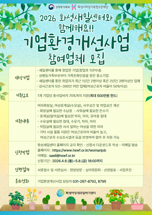 | 제목 | 2026년 화성새일센터와 함께 하는 '기업환경개선' 사업 참여 업체 모집 | ||