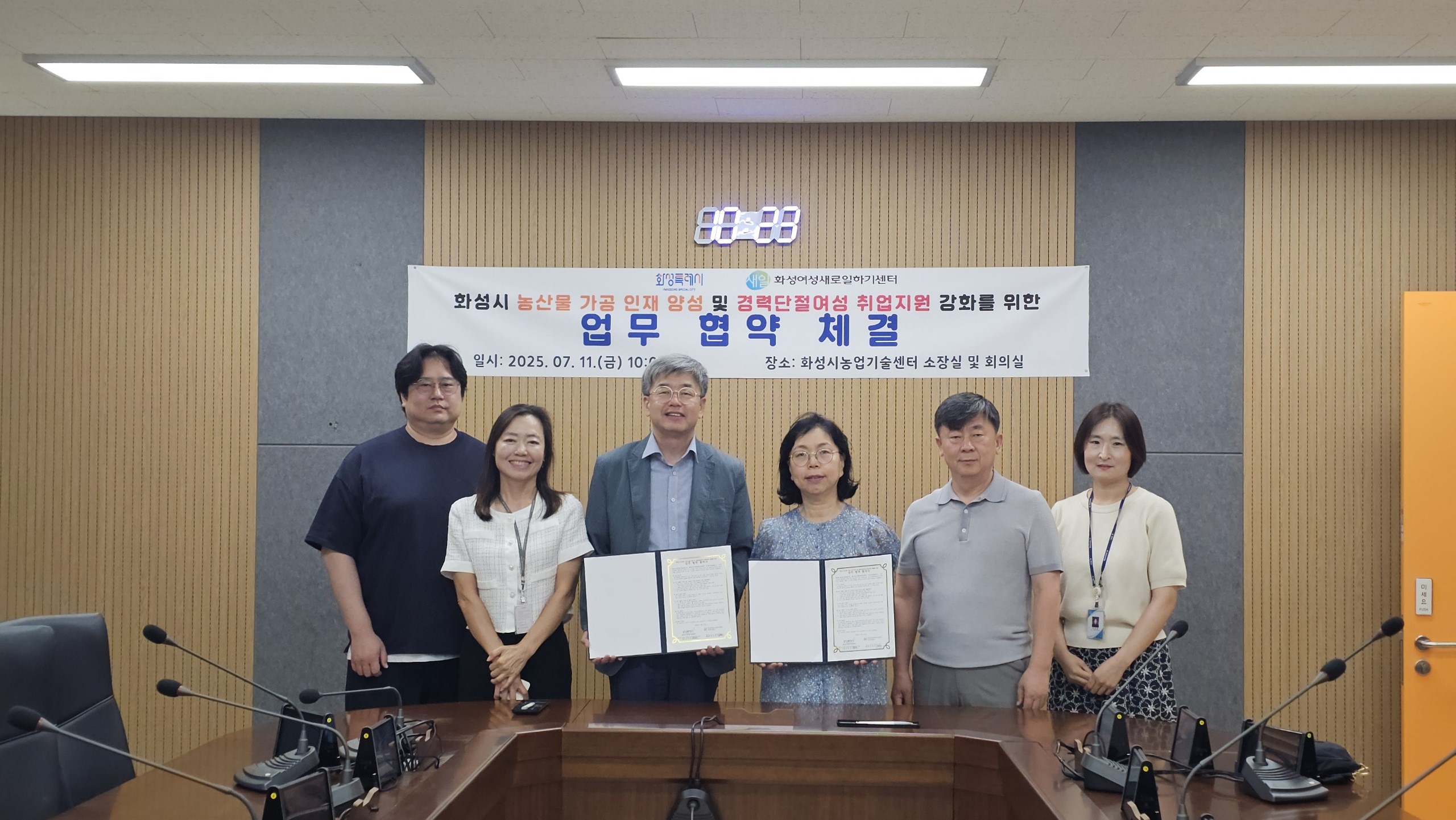 (재)화성시여성가족청소년재단(대표이사 박윤희) 화성여성새로일하기센터와 화성특례시 농업기술센터(소장 송성호)는 지난 7월 11일 농산물 가공 인재 양성을 위하여 취·창업 지원에 관한 업무를 협조하고 상호협력을 강화하기 위해 업무협약을 체결하여 적극 협력하기로 했다.