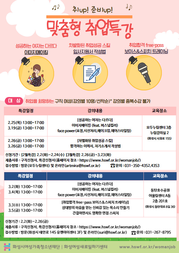 화성여성새로일하기센터 단기 특강생 모집 취업up! 준비up! 맞춤형 취업특강 - 취업 희망여성을 위한 원데이 단기특강 진행 - 특강 참여자 수료 후 취업연계지원 화성시여성가족청소년재단(대표이사 김진승)은 화성시 지원으로, 화성여성새로일하 기센터에 구직등록한 경력단절여성 및 구직희망 여성들을 대상으로 단기 취업특강 을 진행한다. 화성여성새로일하기센터는 화성시 및 인근 거주 여성들을 대상으로 직업교육훈련, 취업처 연계 등 종합적인 취업지원서비스를 제공하고 있다. 이번 단기특강은 취업을 목적으로 하는 여성들에게 면접 이미지메이킹, 면접 스피치, 입사 지원서 작성법, 변화하는 고용환경 이해 등 취업시 어려움을 느끼는 분야를 일일 특강을 통해 실질적으로 지원하기 위한 취지로 운영된다.