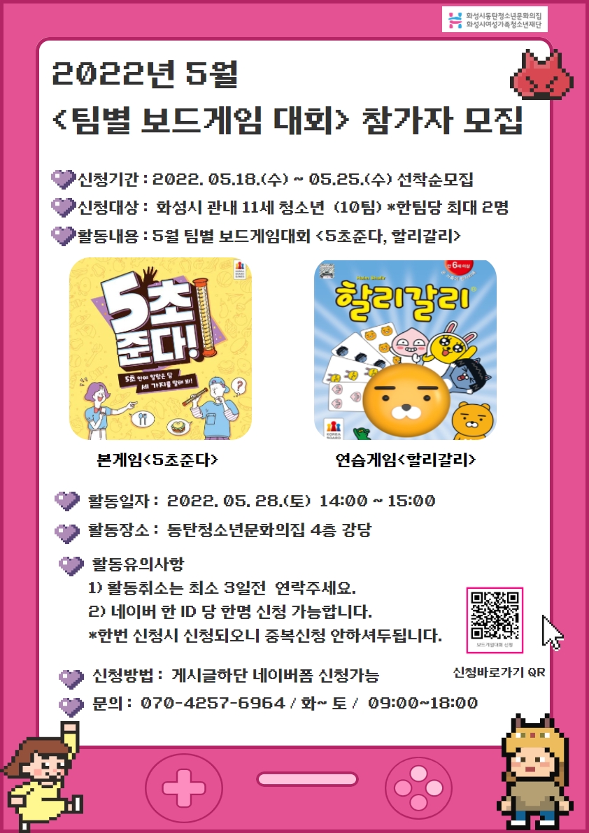 제목 2022 년 5월 팀별 보드게임대회 참가자 모집 작성일 2022년 5월 18일 17시 49분 조회수 374 첨부 파일 아이콘제목을 입력하세요 (48).jpg (444.27KB)다운로드 아이콘 모집링크https://naver.me/FABfb17k 목록보기