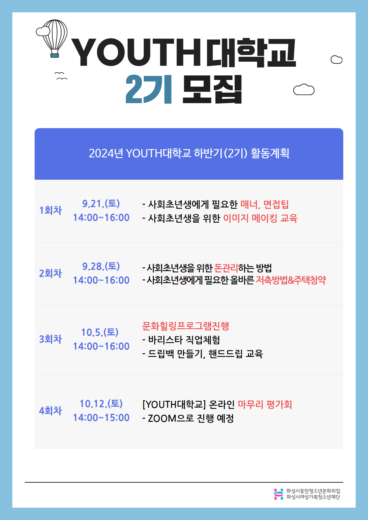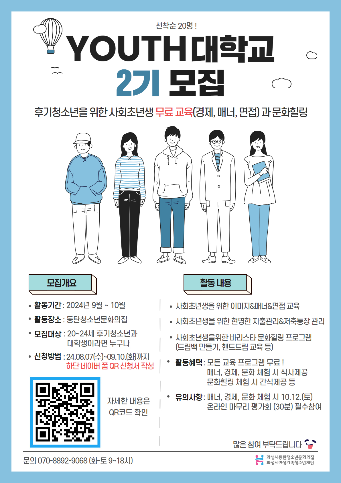 | 제목 | [동탄청소년문화의집] YOUTH대학교 2기 참가자 모집 | ||