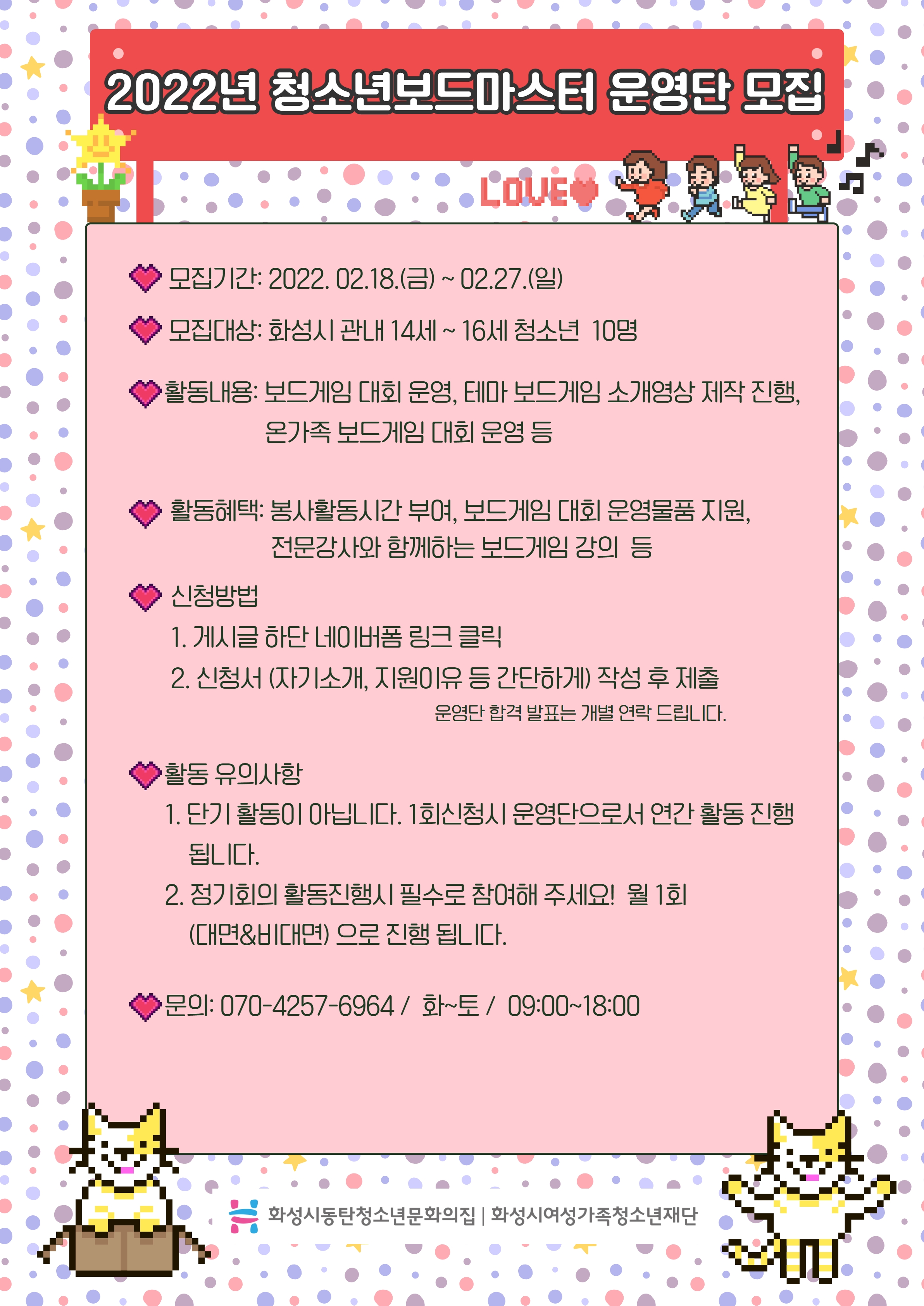 제목 2022년 청소년보드마스터 운영단 모집 작성일 2022년 2월 18일 15시 8분 조회수 384 첨부 파일 아이콘제목을 입력하세요 (13).jpg (1.56MB)다운로드 아이콘 신청링크 http://naver.me/5wmOvg8Z 목록보기