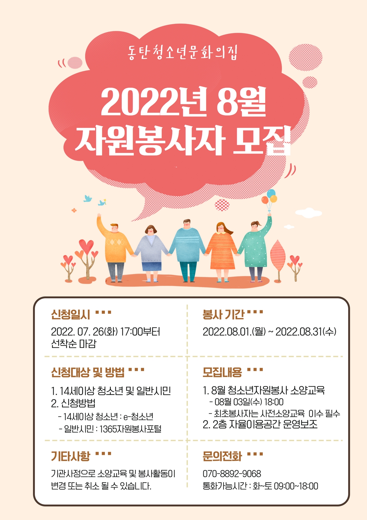 | 제목 | 동탄청소년문화의집 2022년 8월 자원봉사자 모집 | ||