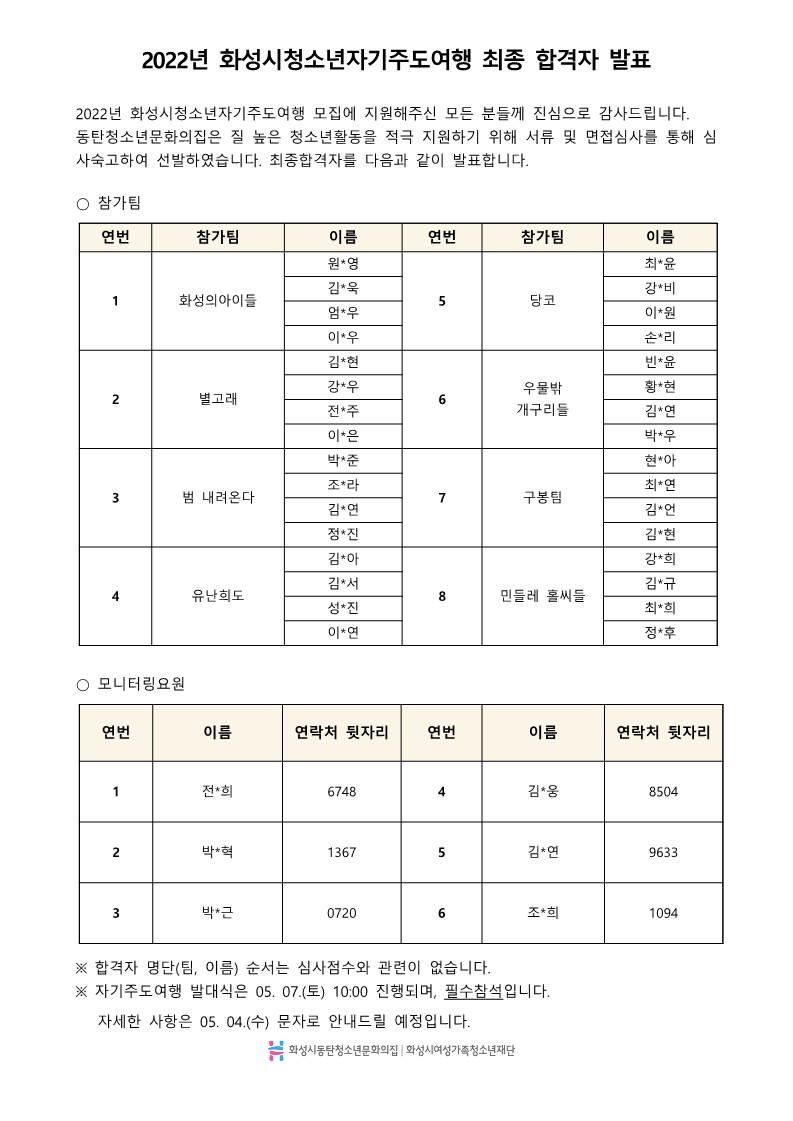 제목 2022년 화성시청소년자기주도여행 최종합격자 발표 작성일 2022년 4월 20일 13시 45분 조회수 512 첨부 파일 아이콘최종합격자안내_1.jpg (128.83KB)다운로드 아이콘 목록보기