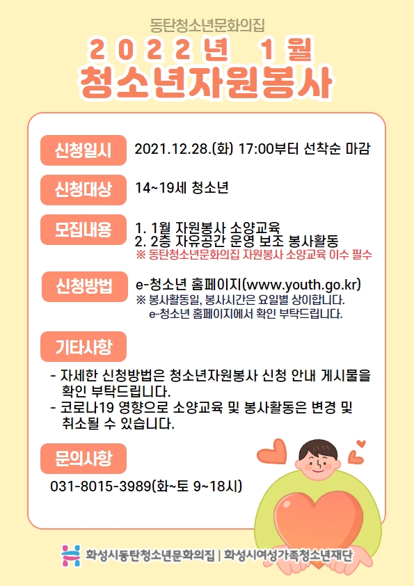 제목 2022년 1월 청소년자원봉사 모집 안내 작성일 2021년 12월 28일 13시 5분 조회수 439 첨부 파일 아이콘제목을 입력하세요 (28).jpg (228.48KB)다운로드 아이콘 목록보기