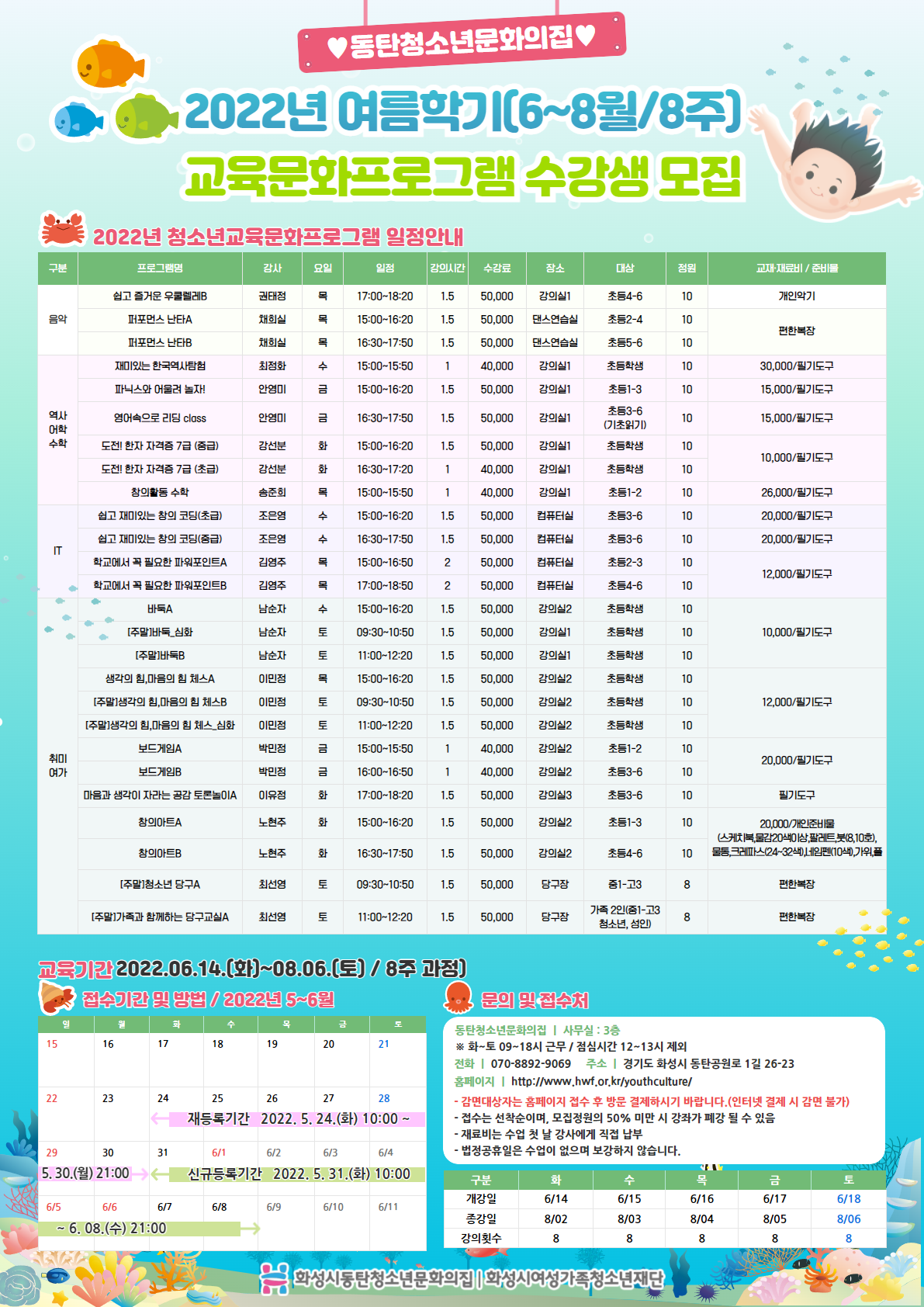 | 제목 | 2022년 여름학기(6~8월/8주) 교육문화프로그램 수강생 모집 | ||