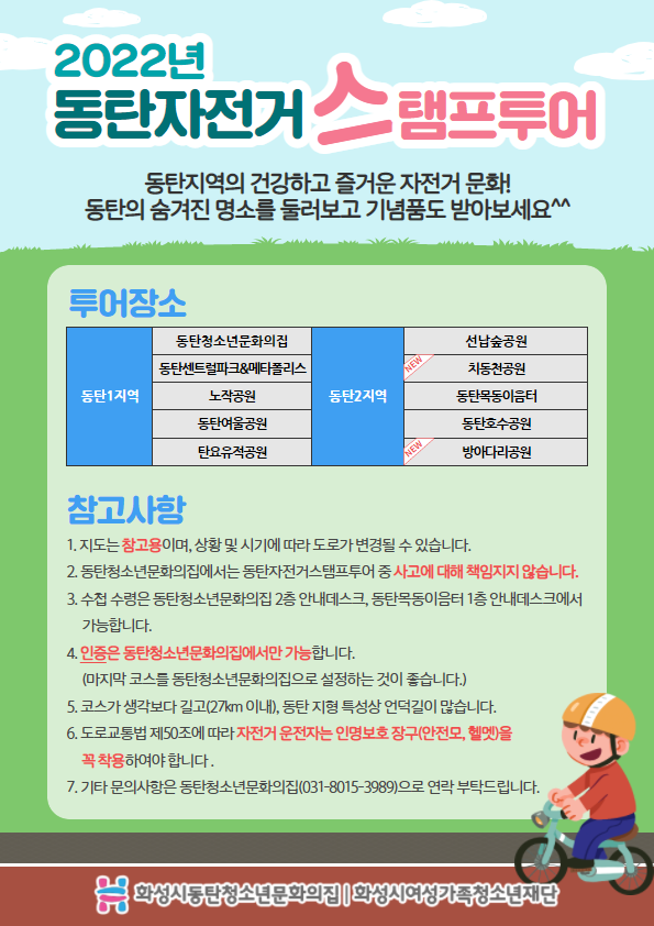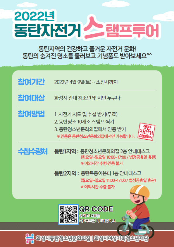 참여기간: 2022년 4월 9일(토) ~ 소진시까지 참여대상: 화성시 관내 청소년 및 시민 누구나 참여방법 1. 자전거 지도 및 수첩받기(무료) 2. 동탄명소 10개소 스탬프 찍기 3. 동탄청소년문화의집에서 인증받기 ※ 인증은 동탄청소년문화의집에서만 가능합니다.