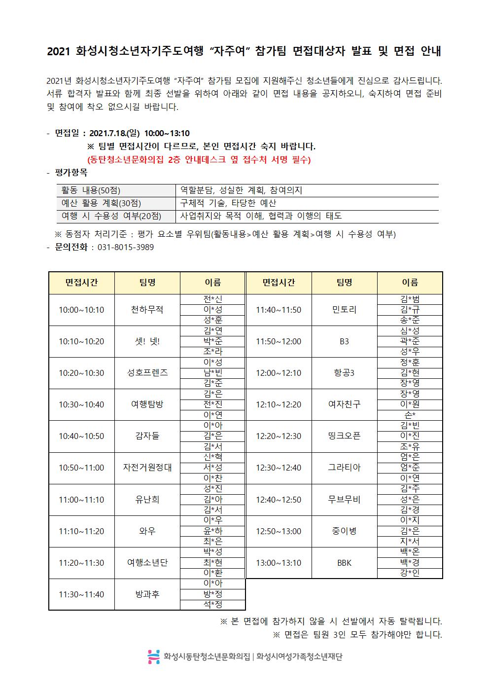 | 첨부 | 파일 아이콘2021 화성시청소년자기주도여행 “자주여” 참가팀 면접대상자 발표 및 면접 안내001.jpg (194.87KB)다운로드 아이콘 | ||